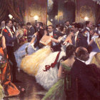 A vibrant ballroom scene features elegantly dressed couples dancing under a grand chandelier. Colorful gowns swirl amidst an enchanting atmosphere of celebration and joy.