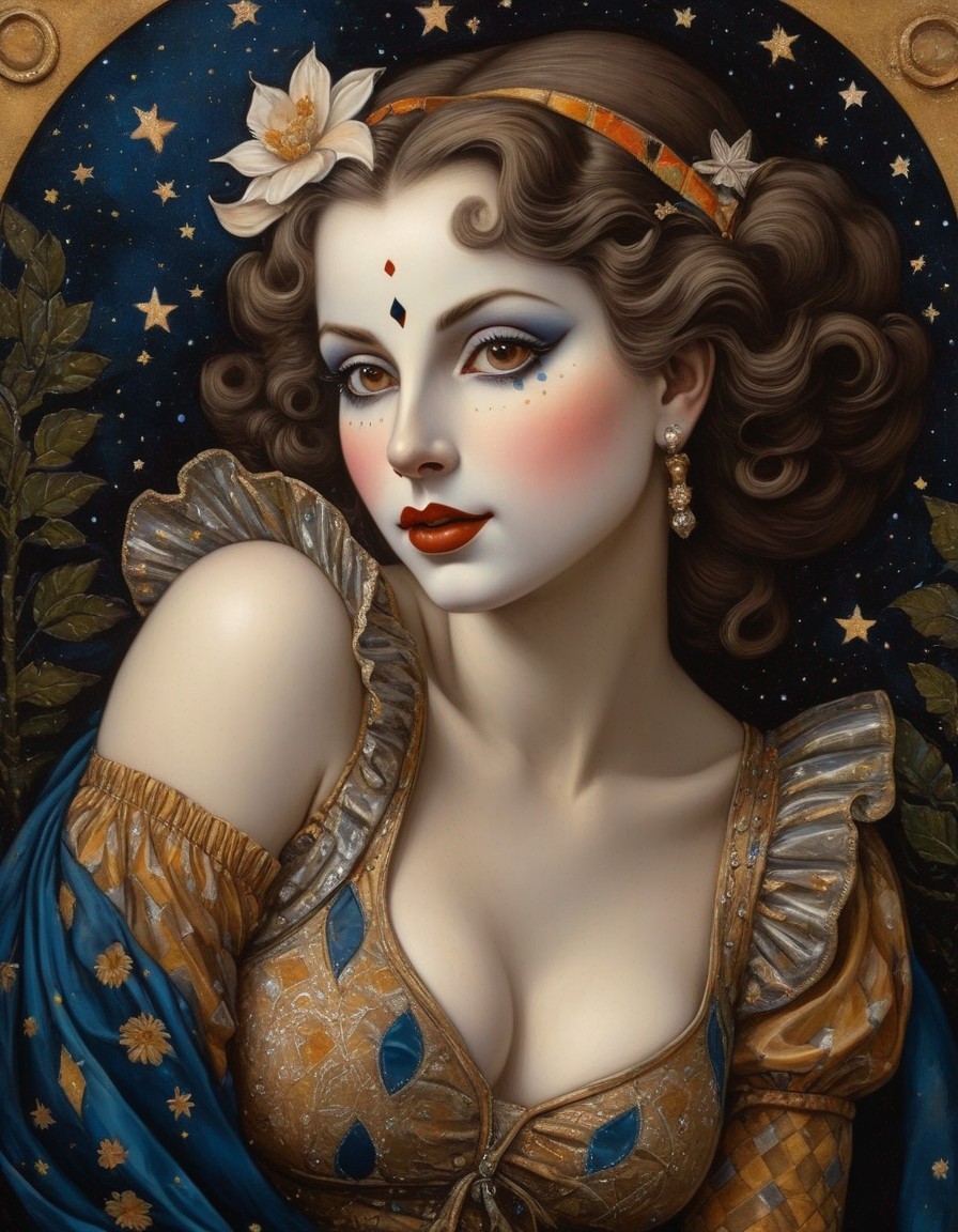 An illustrated woman styled in a fantastical renaissance fashion with starry background and floral hair ornaments.