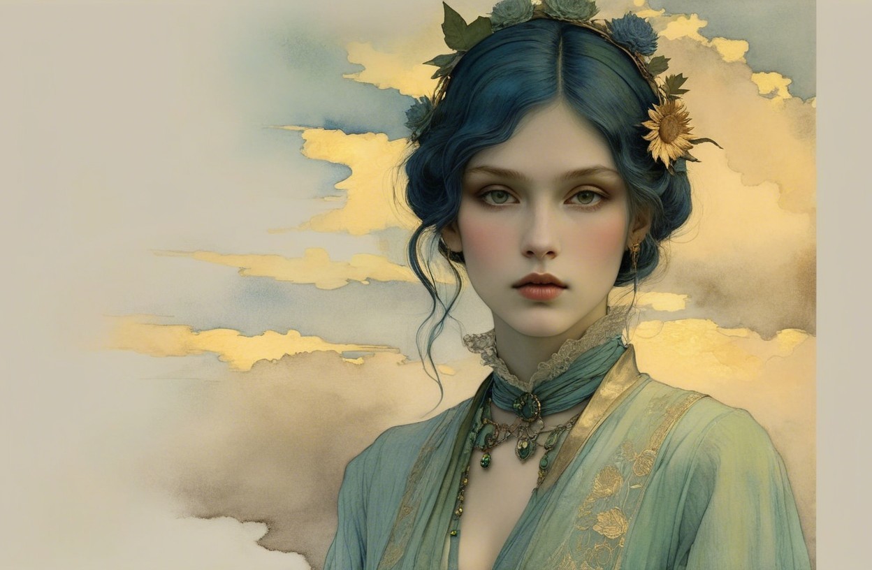 A woman with striking blue hair and a serene expression stands against a luminous moon. She wears an elegant green gown adorned with intricate designs and a captivating gemstone necklace.