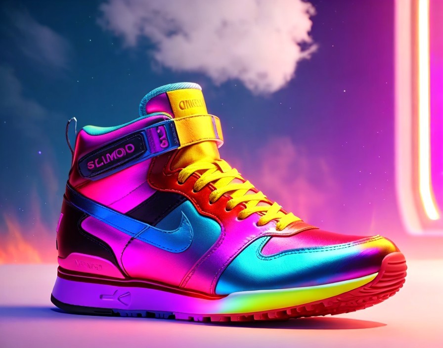 A vibrant, iridescent sneaker set against a neon-lit backdrop with cool blue and pink hues, conveying a modern, stylish aesthetic.