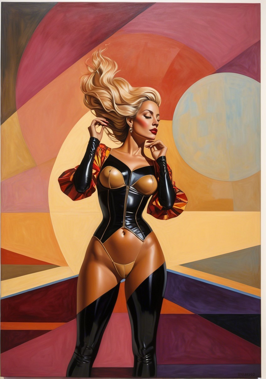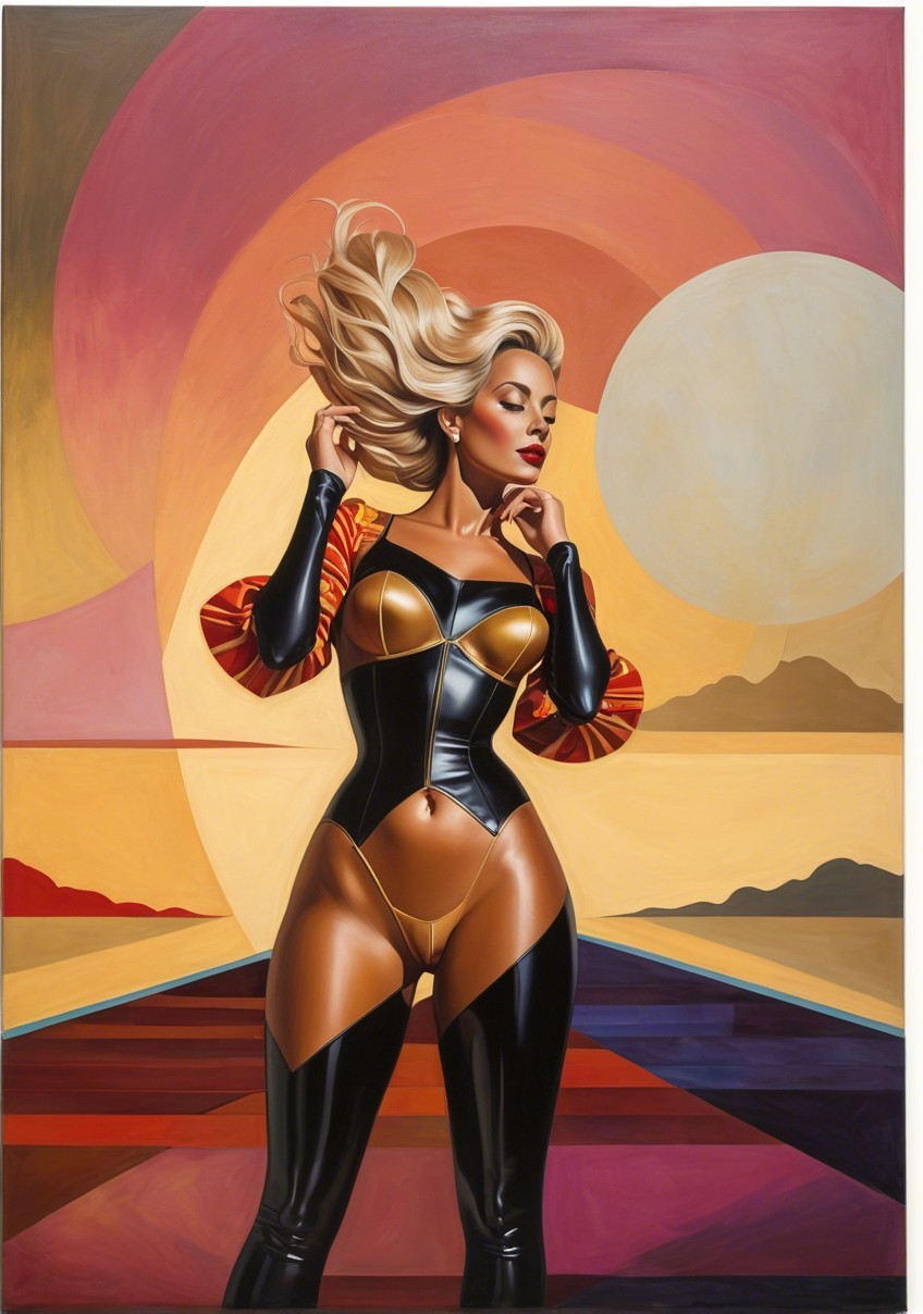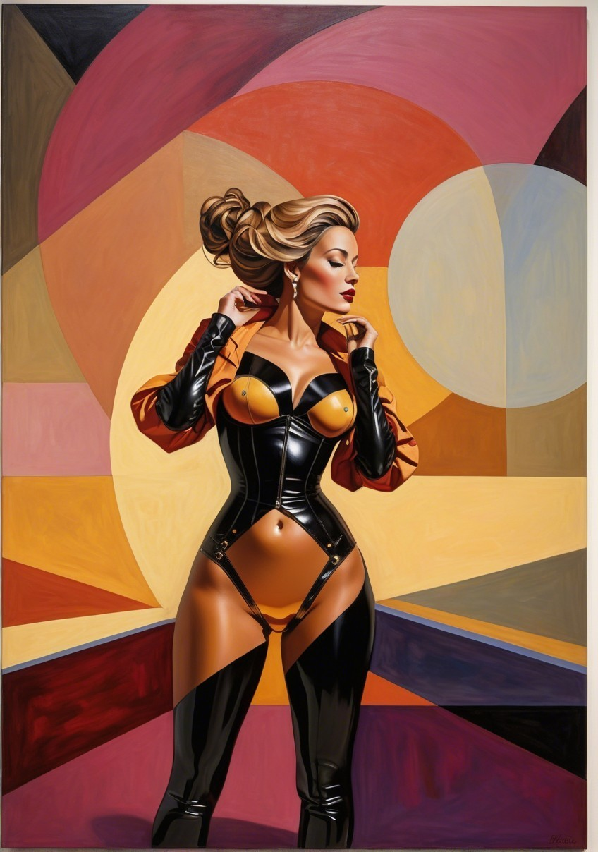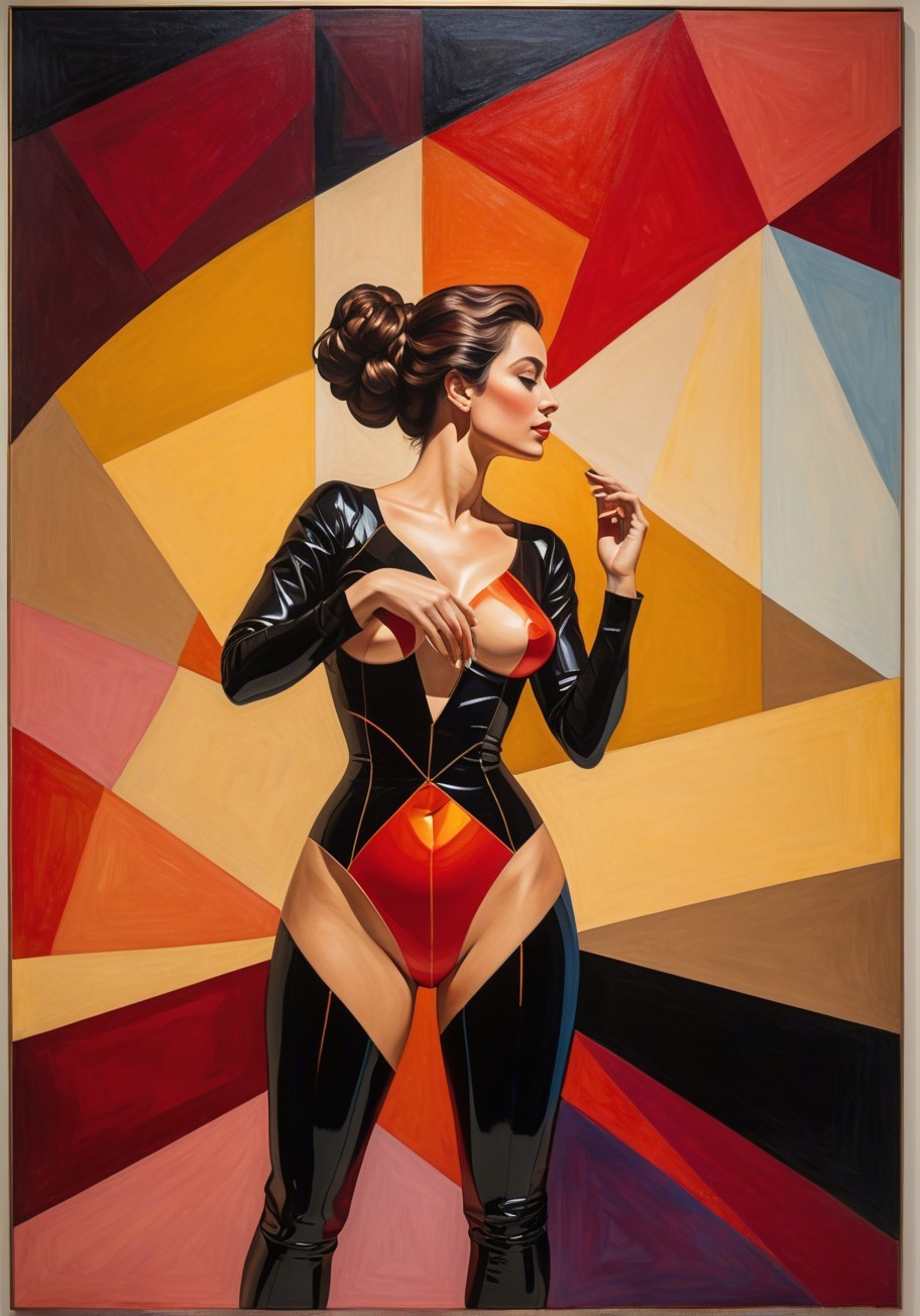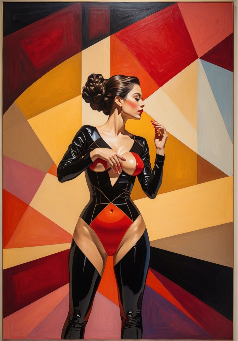 The image features a stylized woman wearing a bold, form-fitting outfit in vibrant colors. The background consists of geometric shapes in warm hues, creating a dynamic and striking contrast.