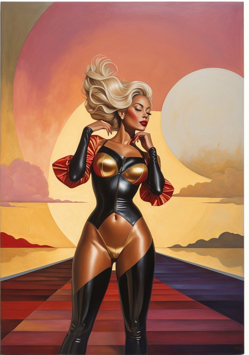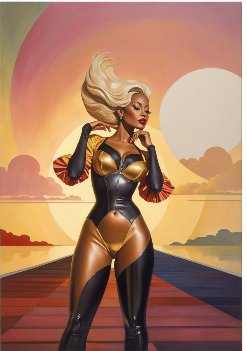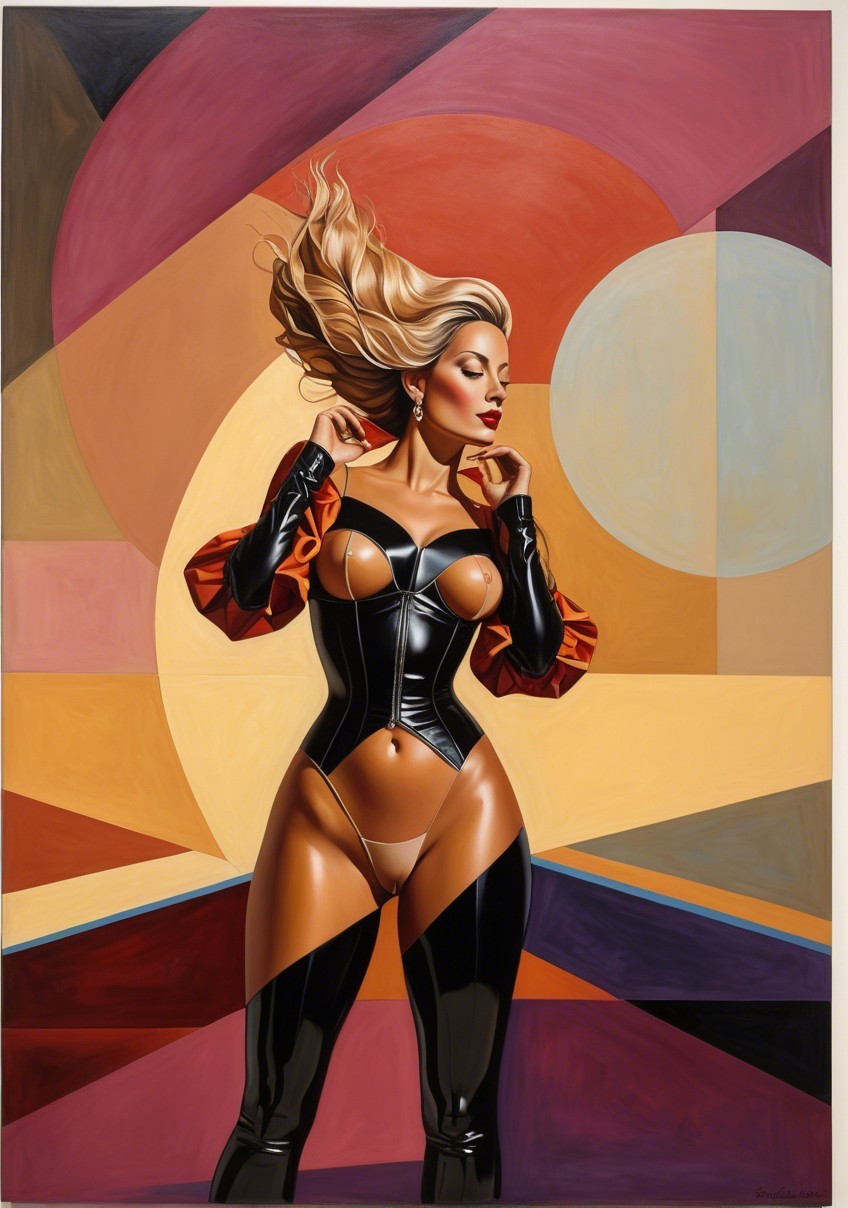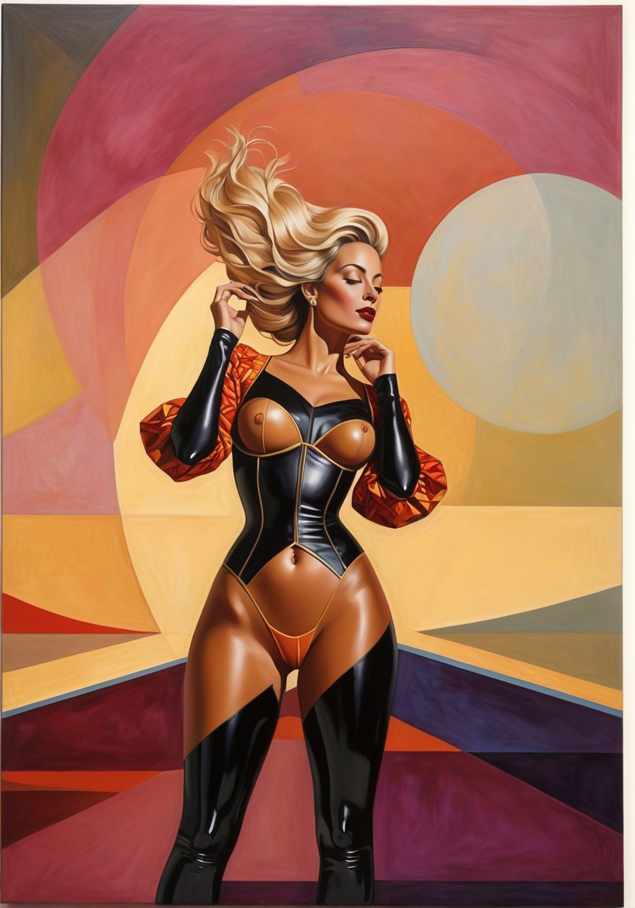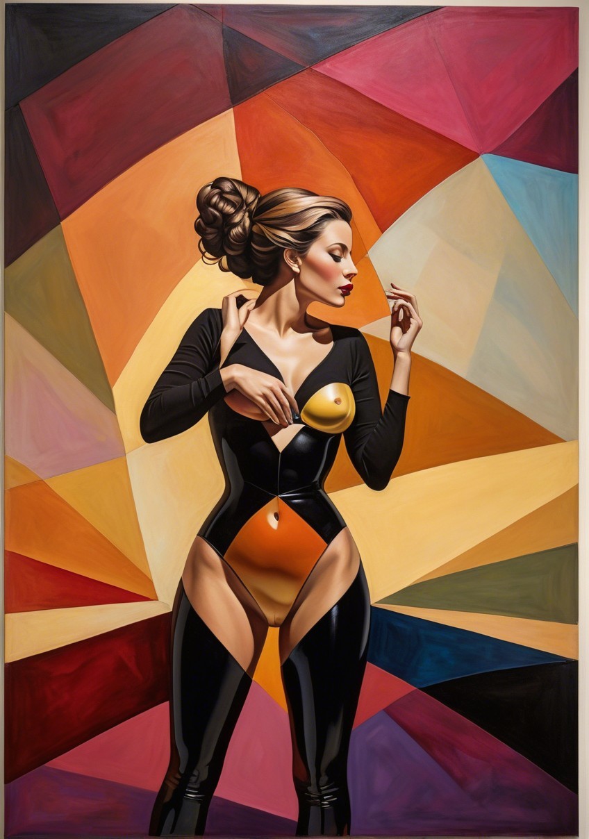 The image features a stylized woman wearing a bold, form-fitting outfit in vibrant colors. The background consists of geometric shapes in warm hues, creating a dynamic and striking contrast.