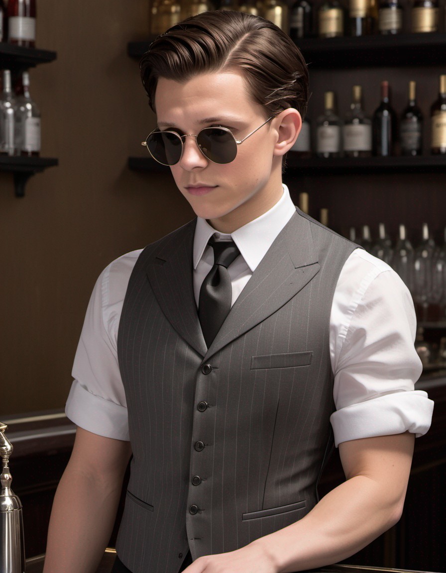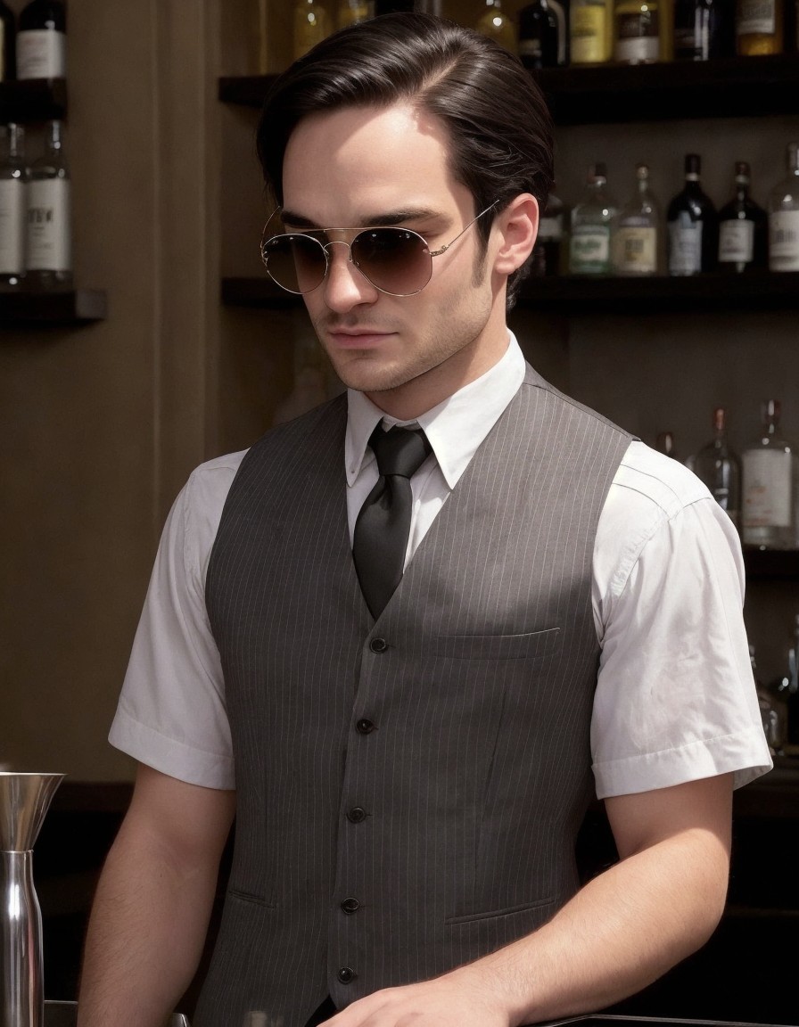 A slick man in a vest and tie, with sunglasses, poses confidently in front of a bar with liquor bottles.