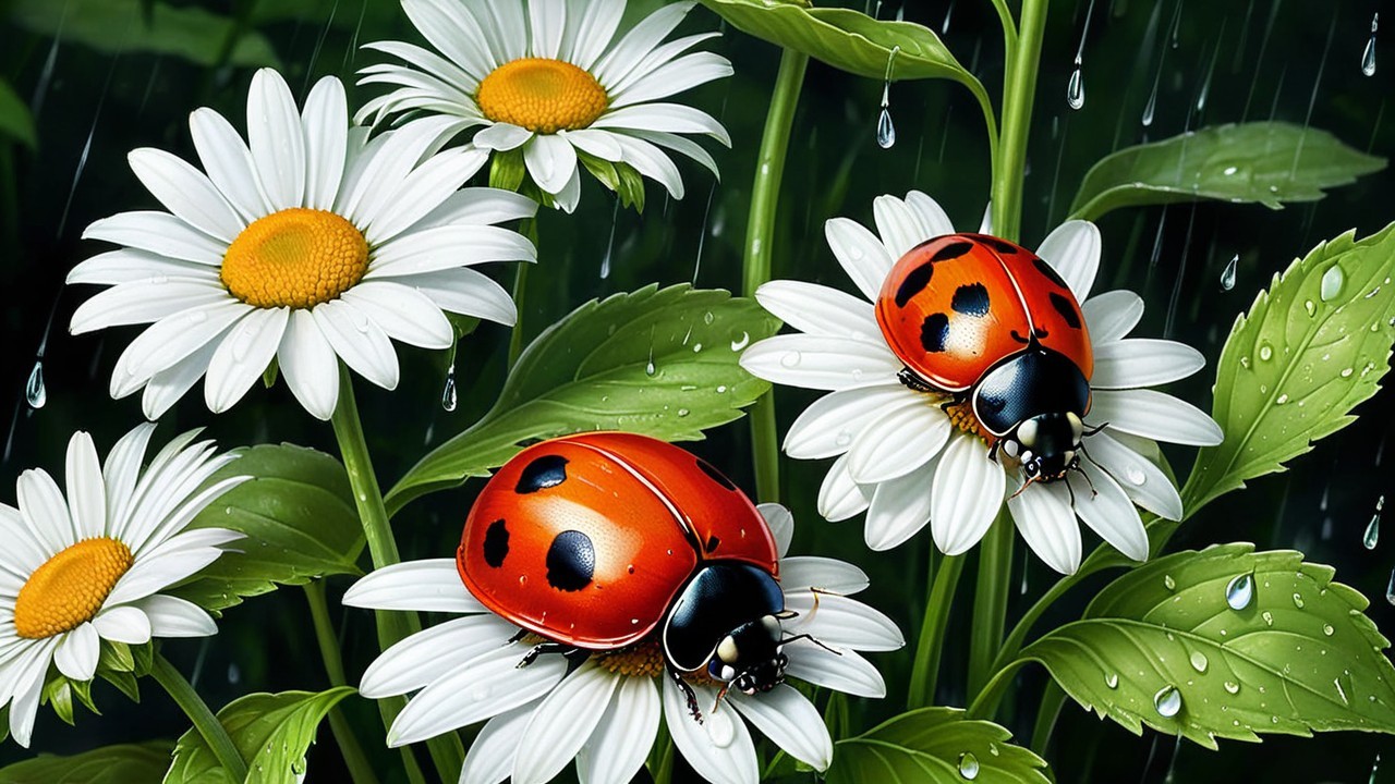 Two vibrant ladybugs with glossy red shells and black spots rest on white daisies, surrounded by green leaves. Raindrops glisten on the petals, creating a fresh and lively scene.