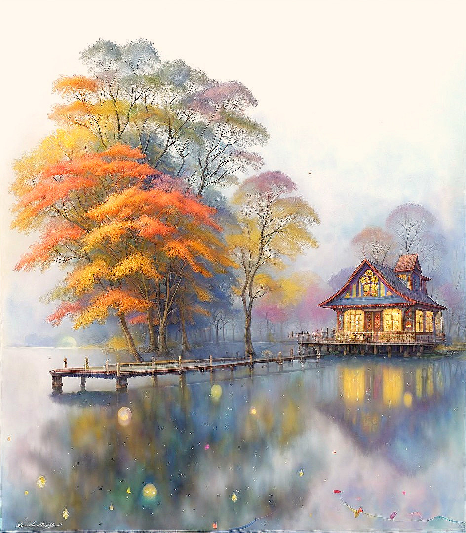 A serene lakeside scene features a cozy wooden cabin surrounded by vibrant autumn trees. Their colorful foliage reflects on the calm water, creating a peaceful and dreamy atmosphere.