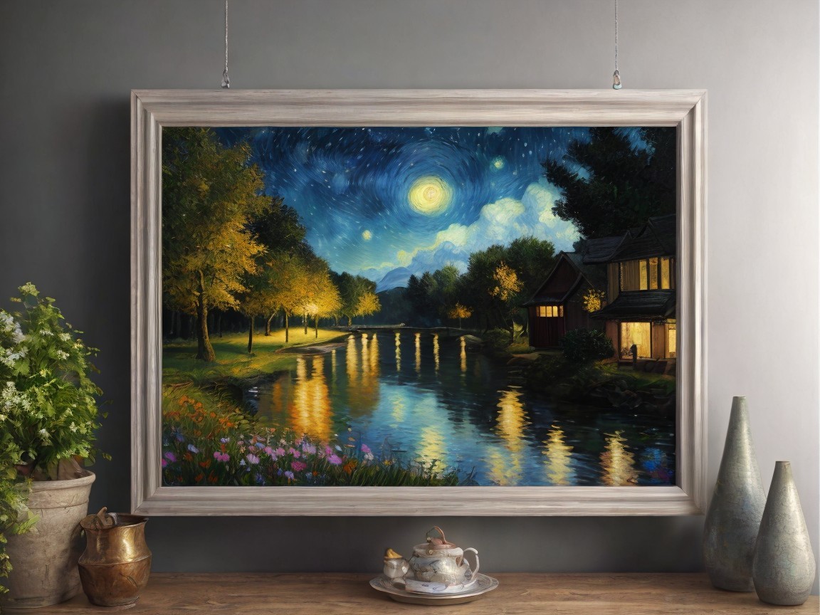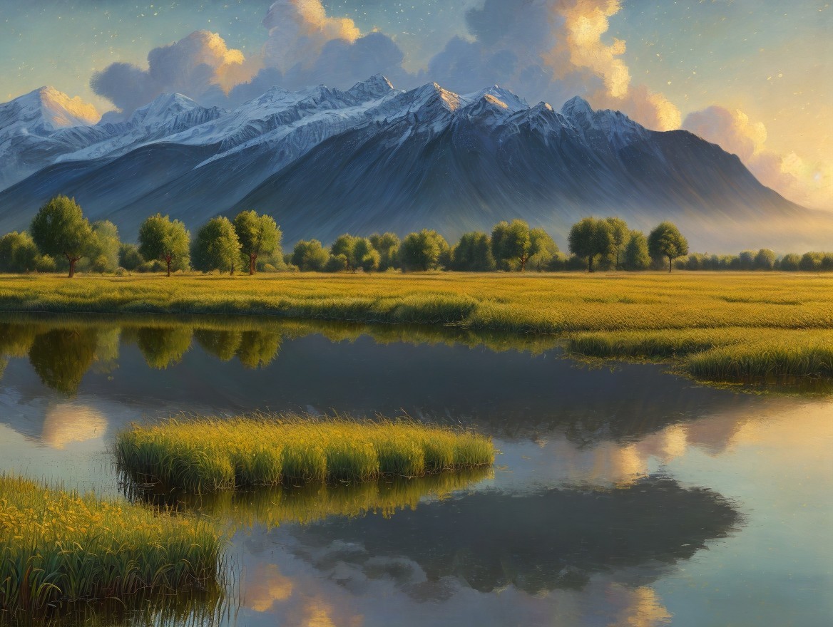 A tranquil landscape featuring majestic mountains reflected in a serene lake. Lush green trees surround the water, illuminated by soft sunlight, creating a harmonious and idyllic scene.