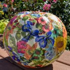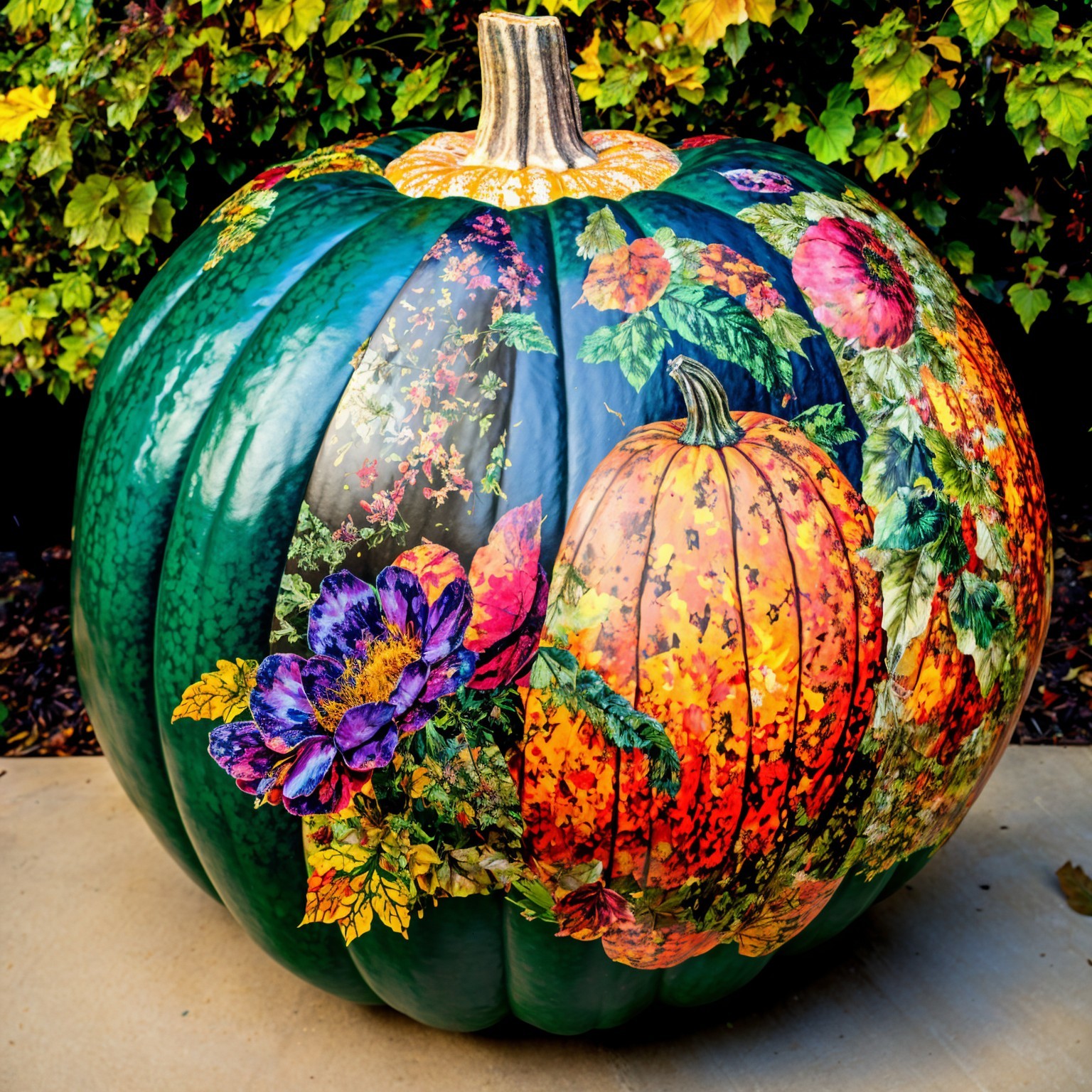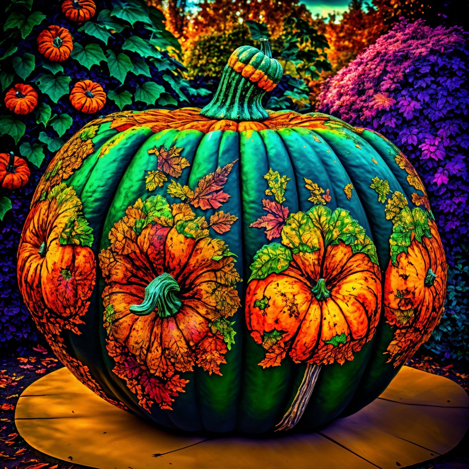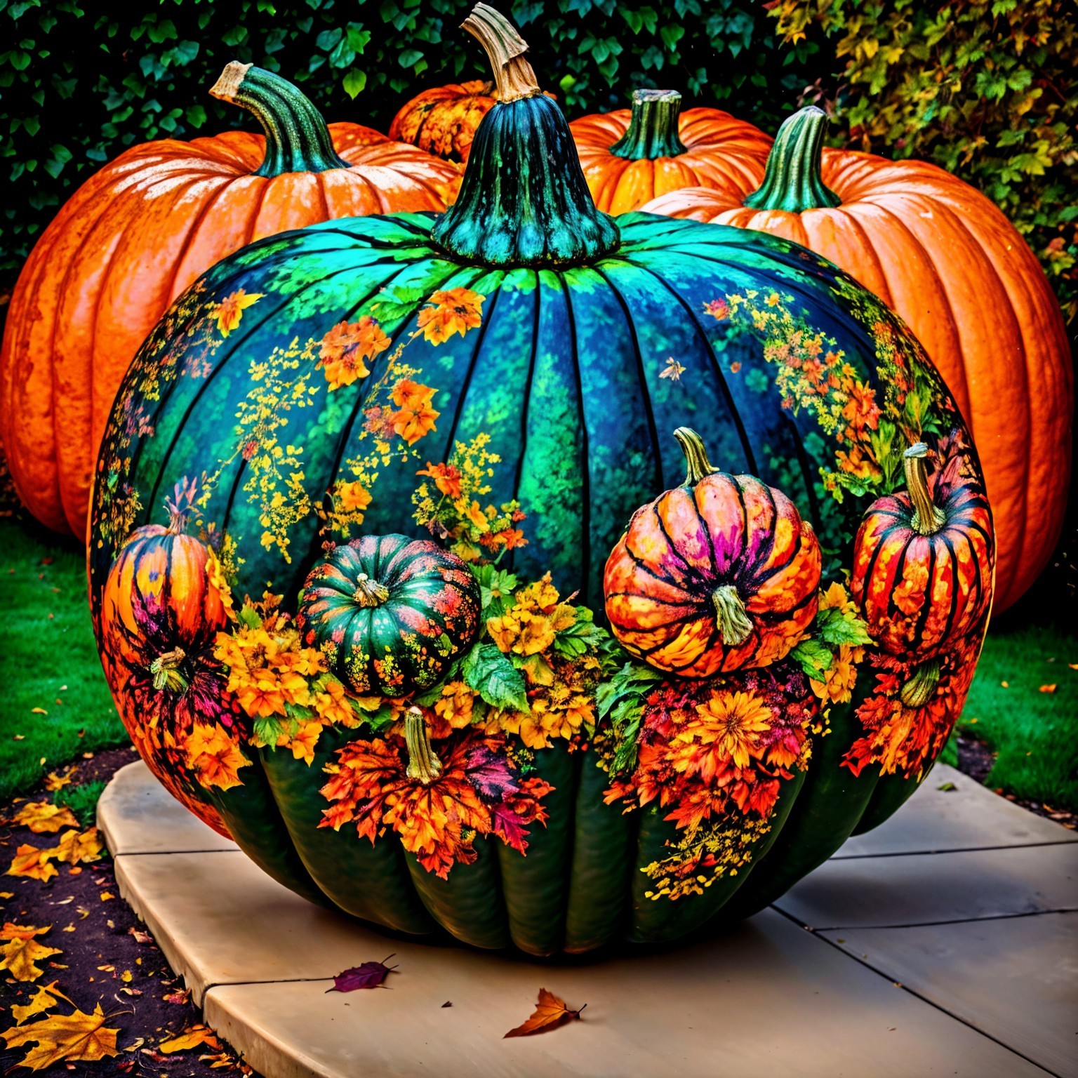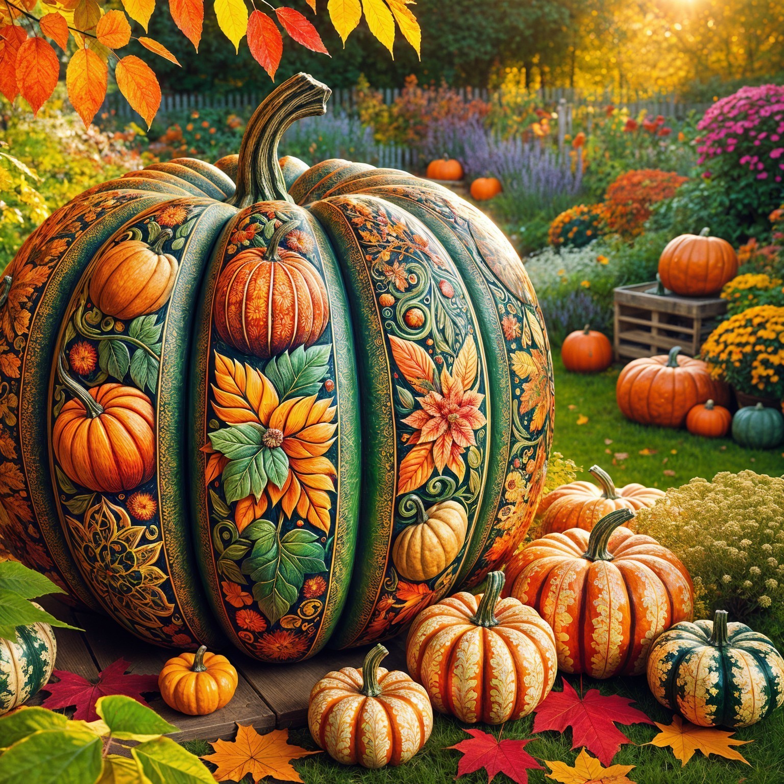 A beautifully decorated pumpkin features intricate carvings of flowers and leaves, surrounded by colorful pumpkins in a vibrant autumn garden, bathed in warm golden light.