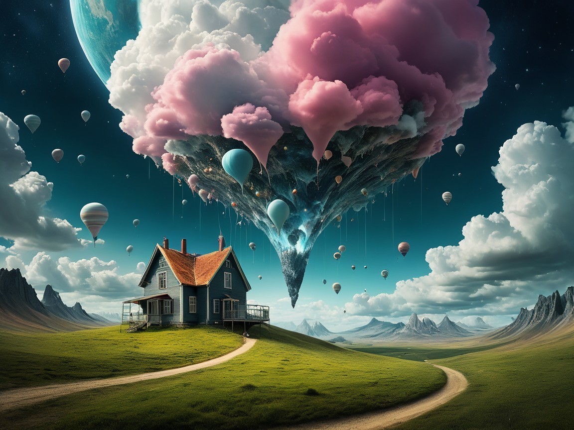 An overhead shot captures a cozy and inviting small blue one-story house, nestled on the crest of a lush green hill. A dirt path meanders up to the house, its roof a warm brown, with a welcoming porch and a small deck on the left. The porch is adorned with a short