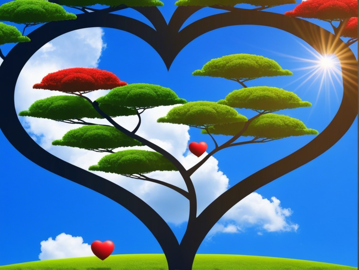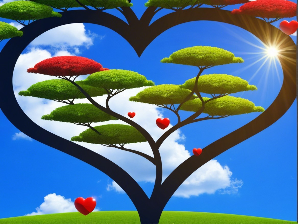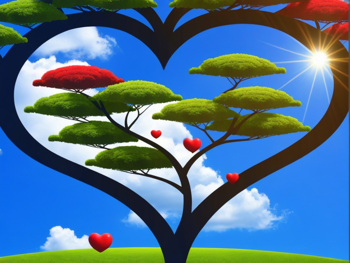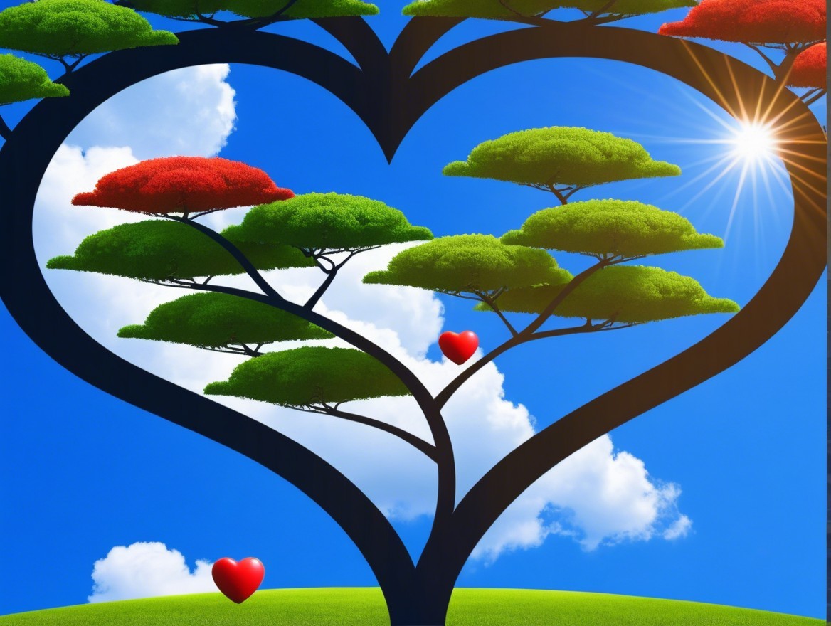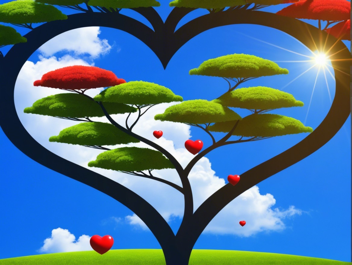 A vibrant heart-shaped tree design features lush green and red foliage against a blue sky, with shining sunlight and whimsical hearts nestled among the branches, evoking love and nature.