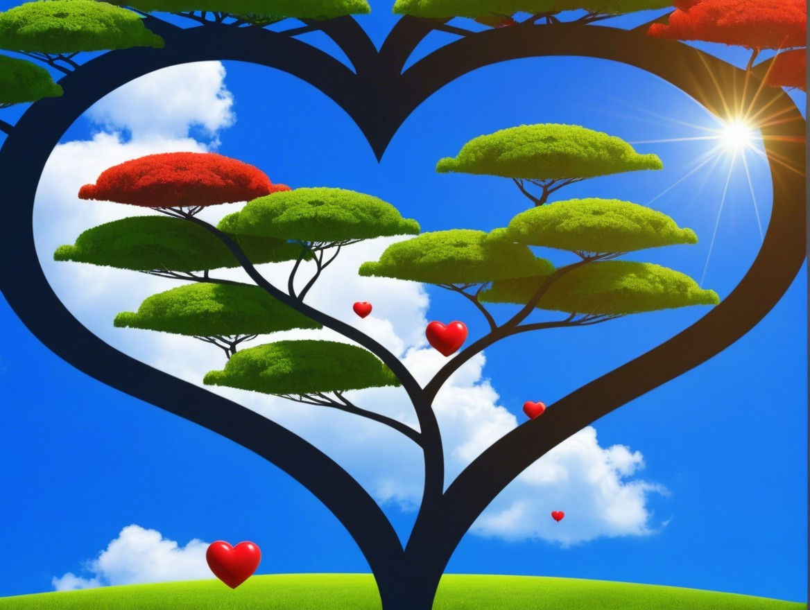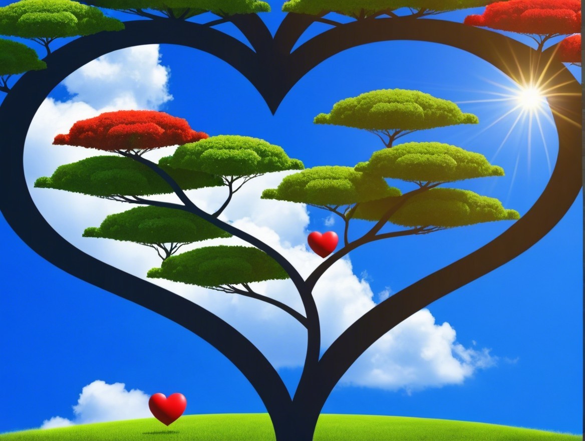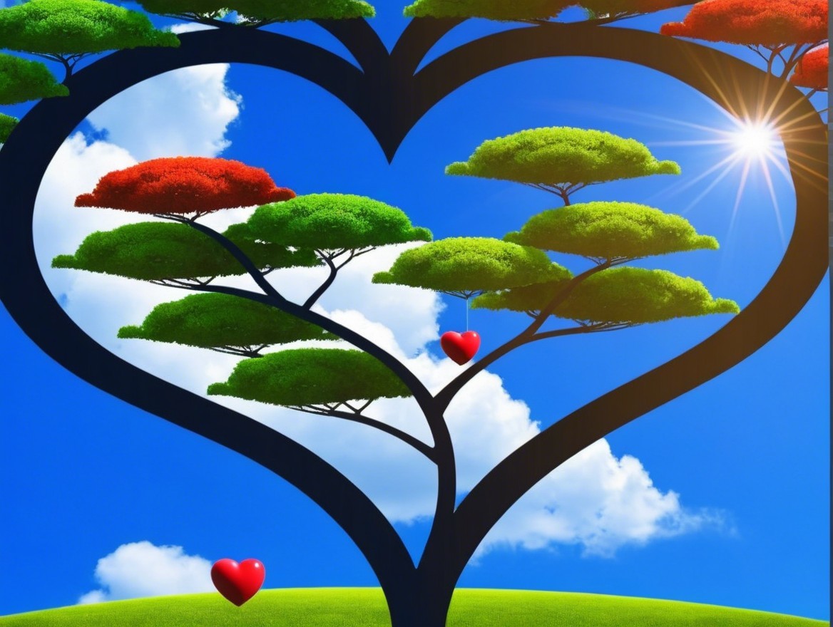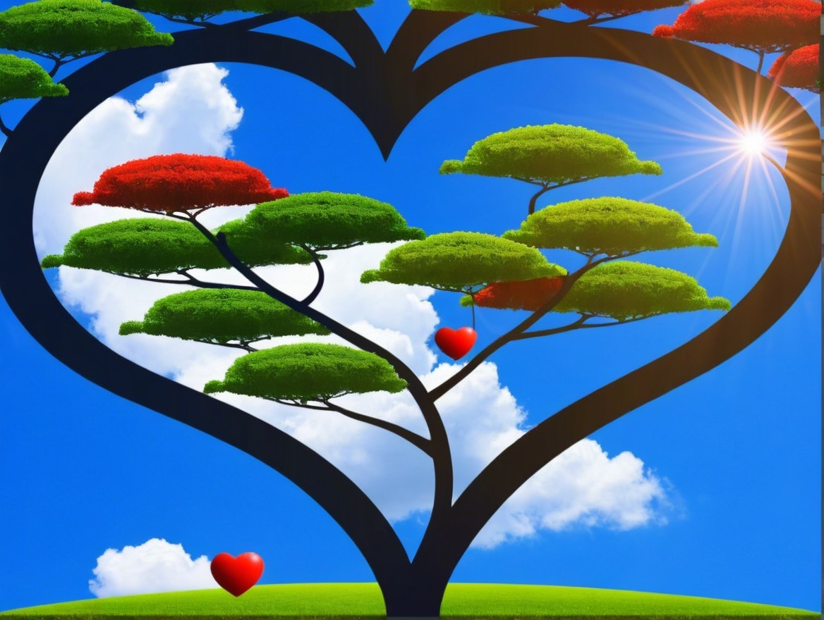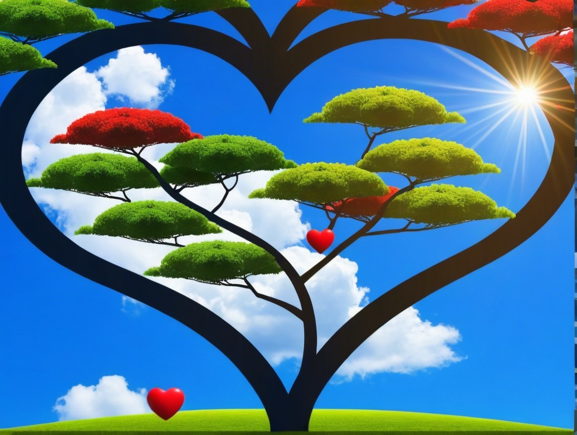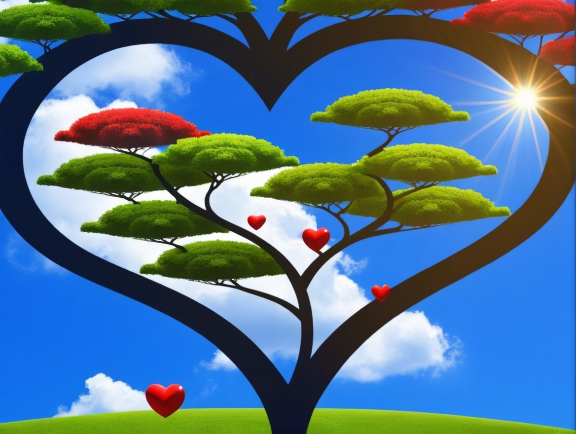 A vibrant heart-shaped tree design features lush green and red foliage against a blue sky, with shining sunlight and whimsical hearts nestled among the branches, evoking love and nature.