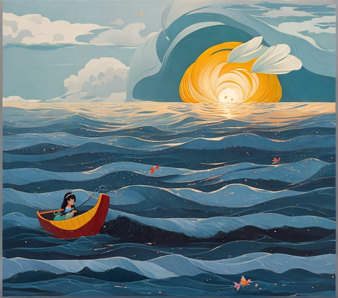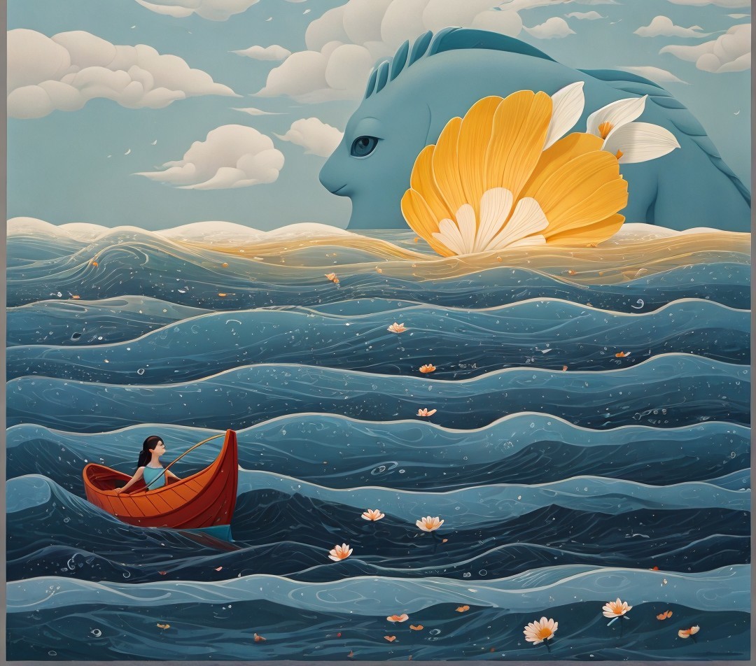 A whimsical illustration of a person rowing a boat on a wavy sea, with a giant orange flower, flying fish, and clouds above.