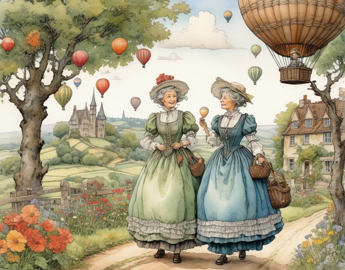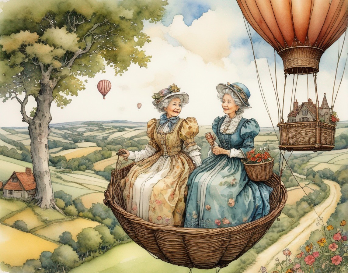 Two women in period dresses are enjoying a hot air balloon ride over a countryside landscape with a house below.