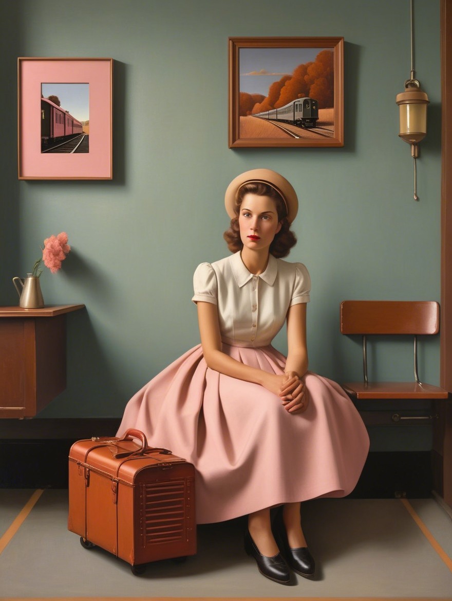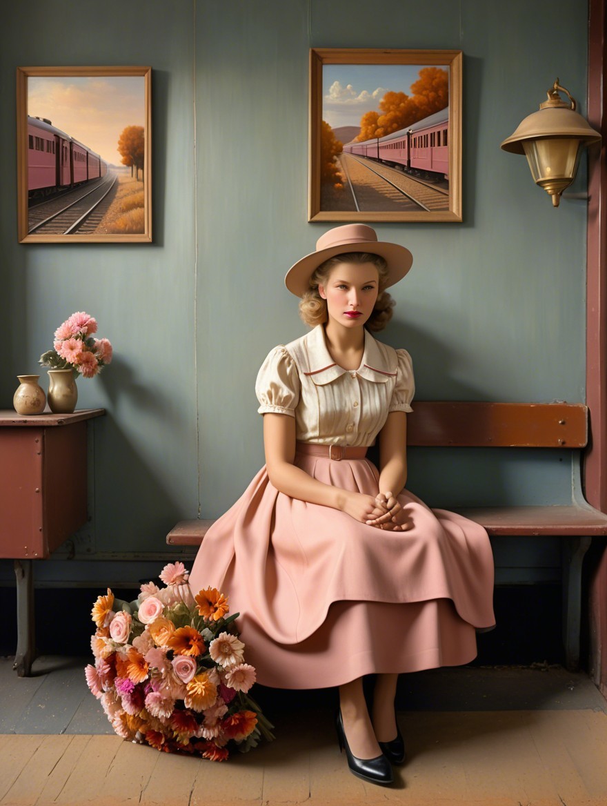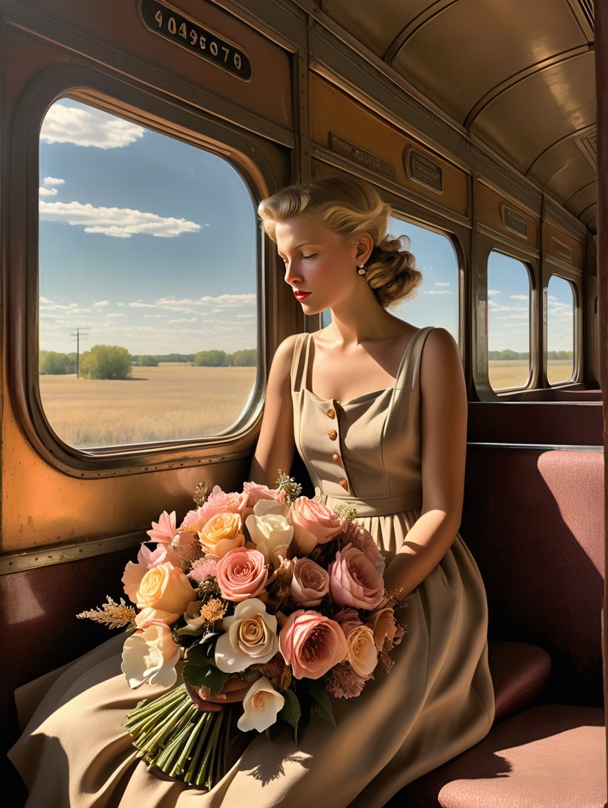 A serene woman sits in a sunlit rock alcove, gazing thoughtfully at breathtaking canyon scenery she is leaving on the train home, draped in a colorful woven skirt that adds warmth to the landscape.