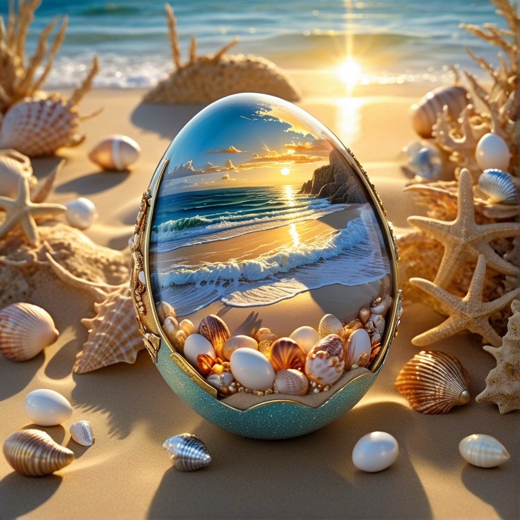 Because I miss summer:)))...A beautiful glass egg captures a serene beach scene, complete with shimmering waves and a vibrant sunset, surrounded by colorful seashells and golden sand.