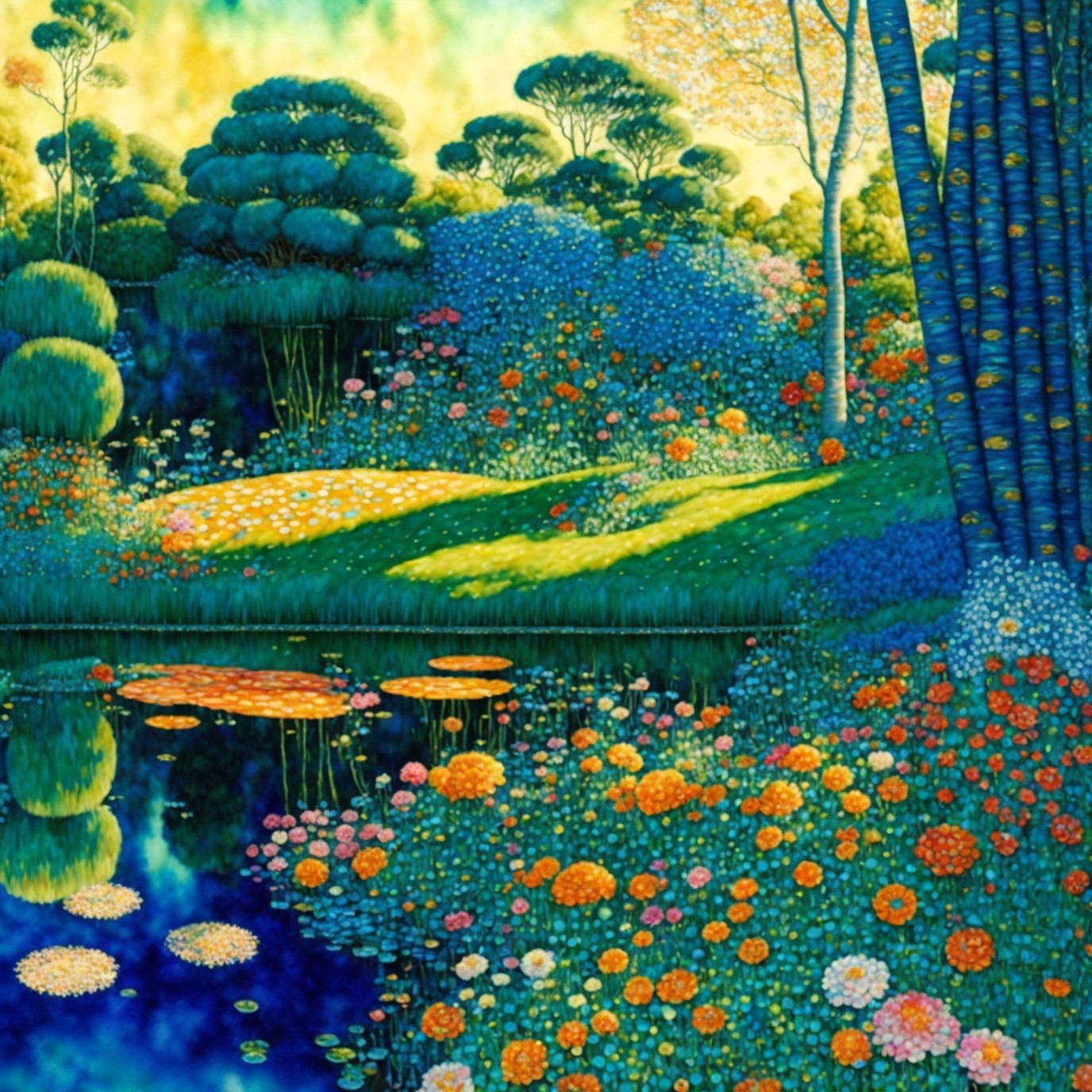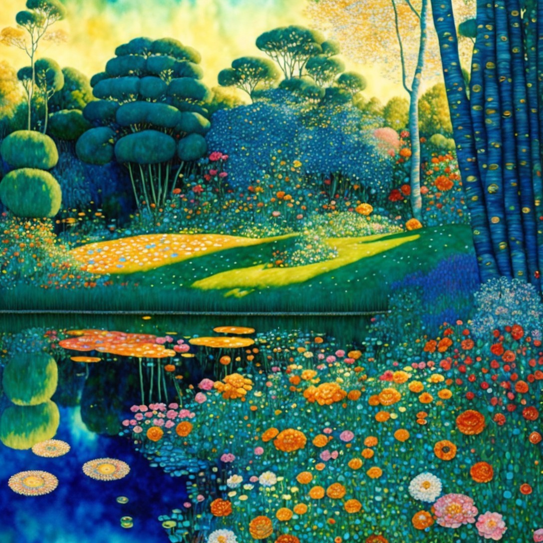 Prompt: "Wide view, 3D watercolor patchwork, in the very best style of Gustav Klimt of a pond reflecting a beautiful Tingatinga style garden with numerous flowers with vibrant spectacular colors, luxurious trees and plants with delicate leaves in shades of azure blue and teal and gold, golden sunrise rays shimmering over the scene, detailed intricate, satiny, high quality, elegant, highly detailed, glistening magic style with elements in the style of Jan Toorop"