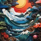 A vibrant seascape featuring rolling waves and a sailing boat amid dramatic cliffs. The sky is a blend of fiery orange and dark clouds, creating a dynamic contrast with lush, colorful foliage.