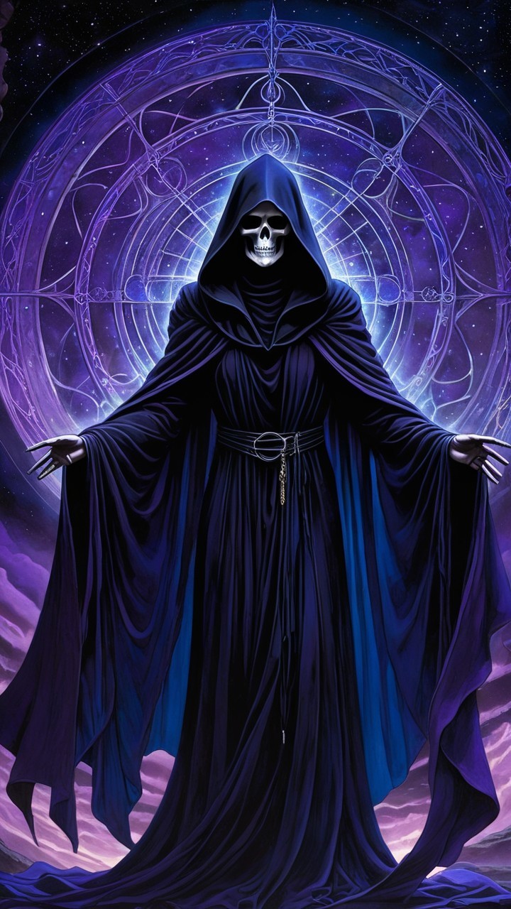 A mysterious figure cloaked in dark robes, adorned with a skeletal mask, stands against a cosmic backdrop. Ethereal symbols glow in purple and blue, enhancing the otherworldly aura.
