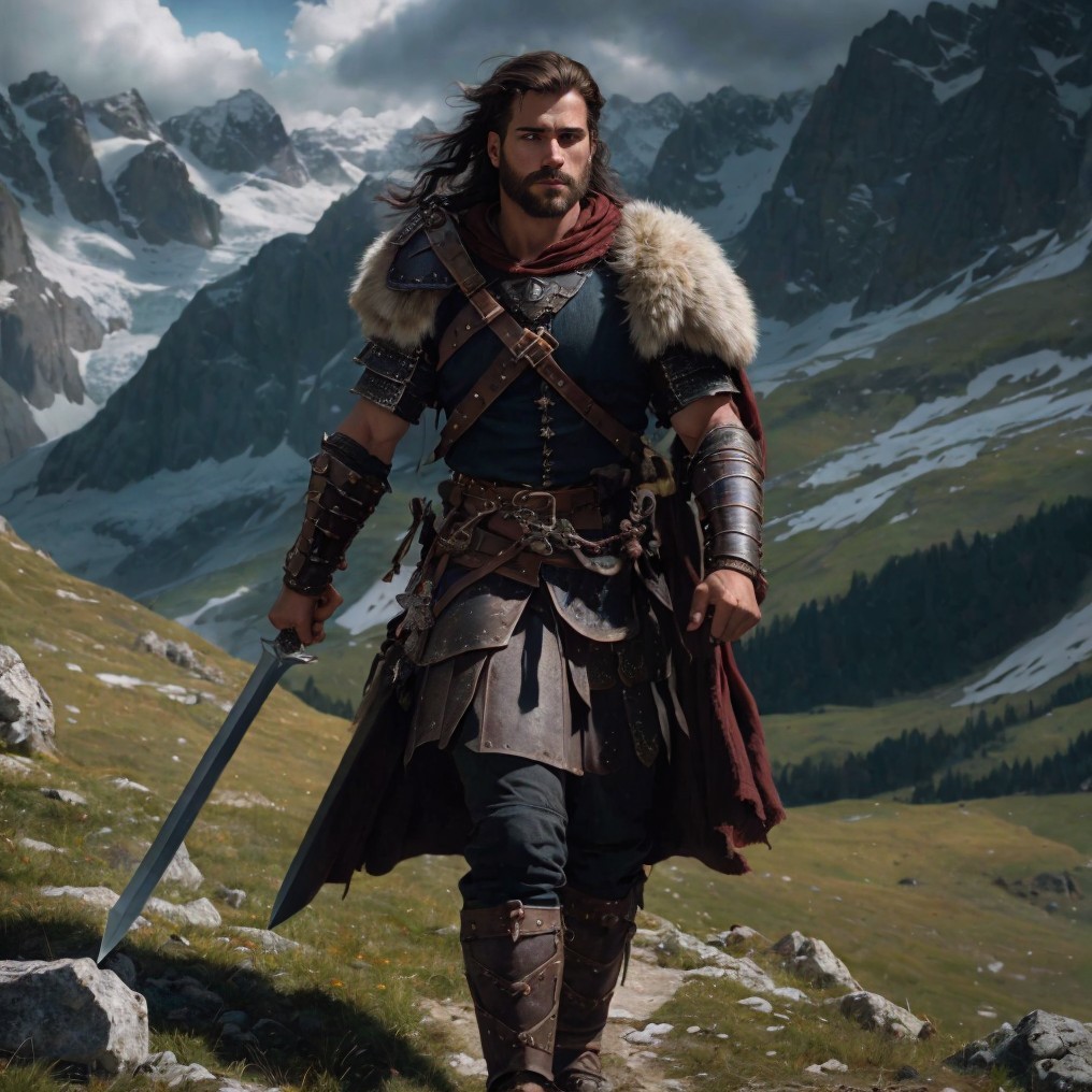 Character study of a Visigoth warrior journeying through the alps. Chaotic good alignment, barbarian. Lean, wiry, fit, masculine role model.
