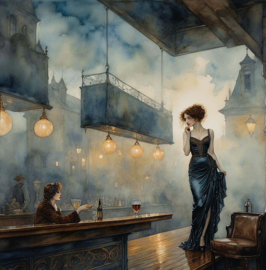 Beautiful moody seductive woman flirting in a bar. elegant fantasy intricate very attractive beautiful award winning fantastic view hyperrealistic ultra detailed high definition crisp quality watercolor Arthur Rackham Gustav Klimt pen and ink Johannes Vermeer Rebecca Guay Michael Parkes Wide open eyes Ella du Cane beautiful elegant intricate fantasy very attractiv muted tones moody