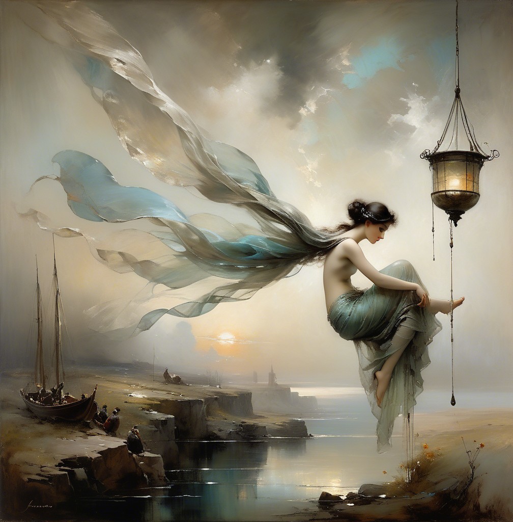 , nostalgia, glory, art in the style of Pino Daeni. Mercury Glass patina, light and gossamer haze, topographic lines, Art Brut, moody, somber, desaturated colors. In the style of John Rogers cox . This artwork amalgamates the artistic styles of Michael Parkes,
