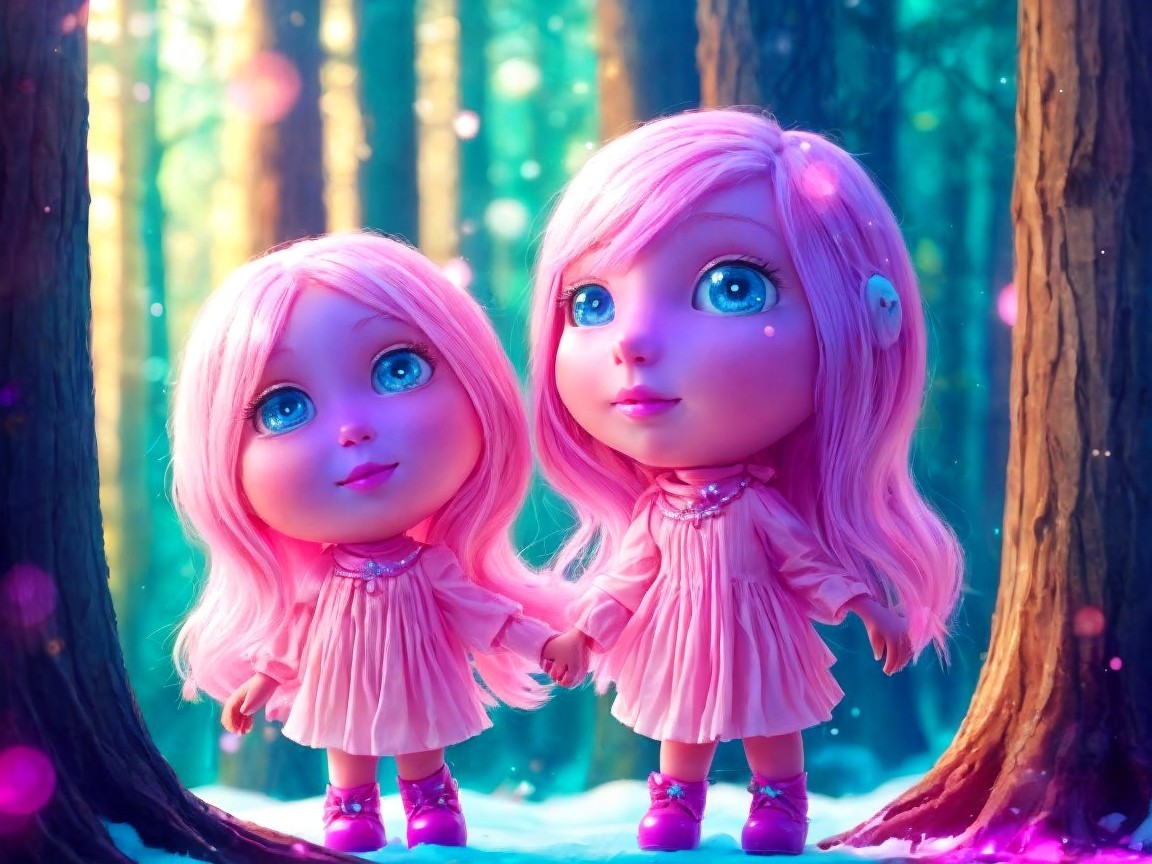 Two whimsical dolls with bright pink hair and sparkling blue eyes stand hand in hand in a snowy forest, dressed in matching pink outfits and adorned with floral accessories.