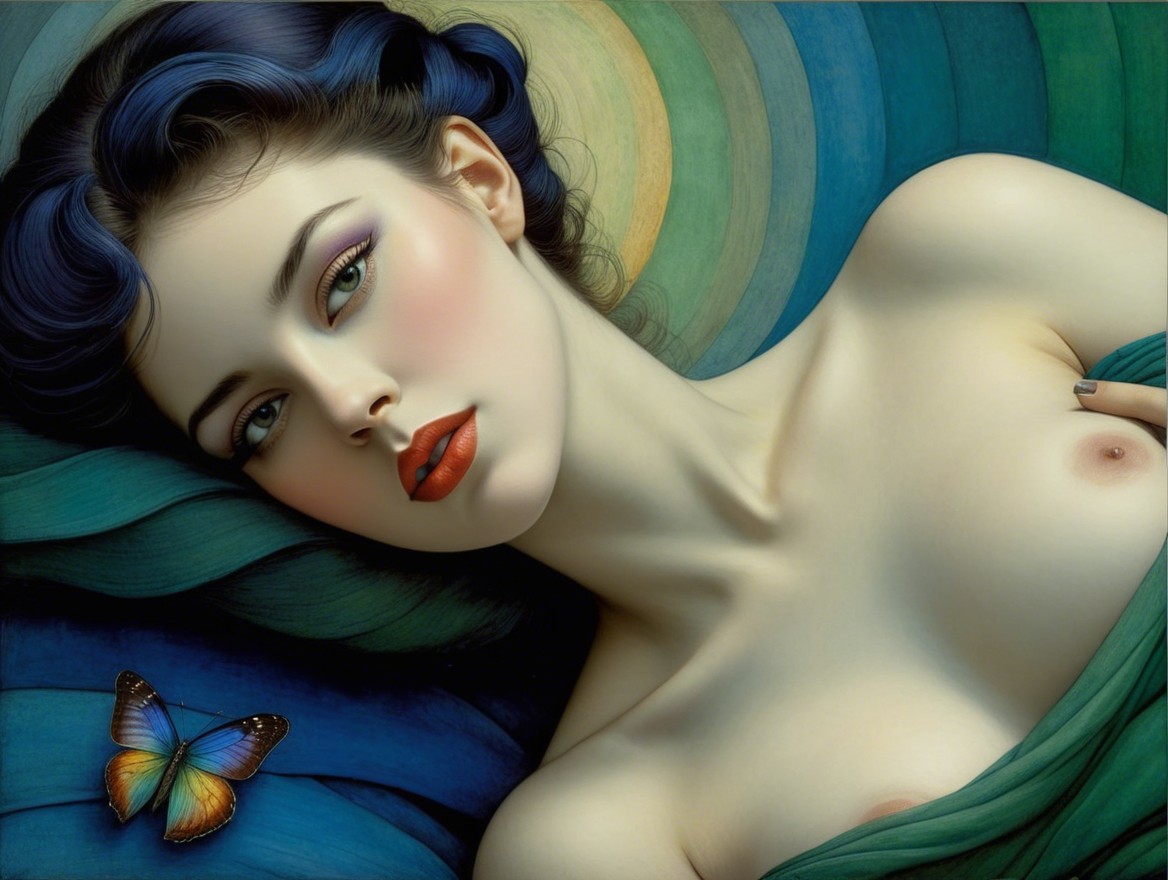 A painting of a woman with red hair and a colorful headscarf looking serene with a subtle smile.