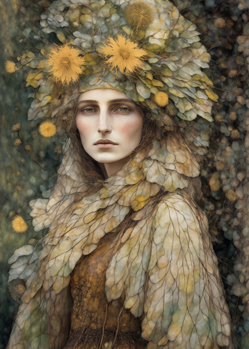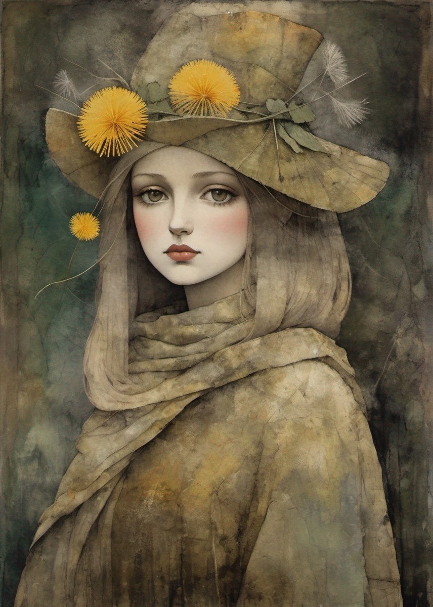 Beautiful woman with a dandelion hat, portrait in ochre, patina of ancient stone with moss, art brut, moody, somber, desaturated colors, in the style of Paul Klee, Arthur Rackham