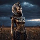A majestic, metallic goddess stands in a vast, barren landscape under a dramatic sky. Intricate armor and a regal headdress highlight her powerful presence.