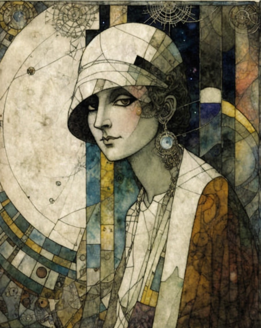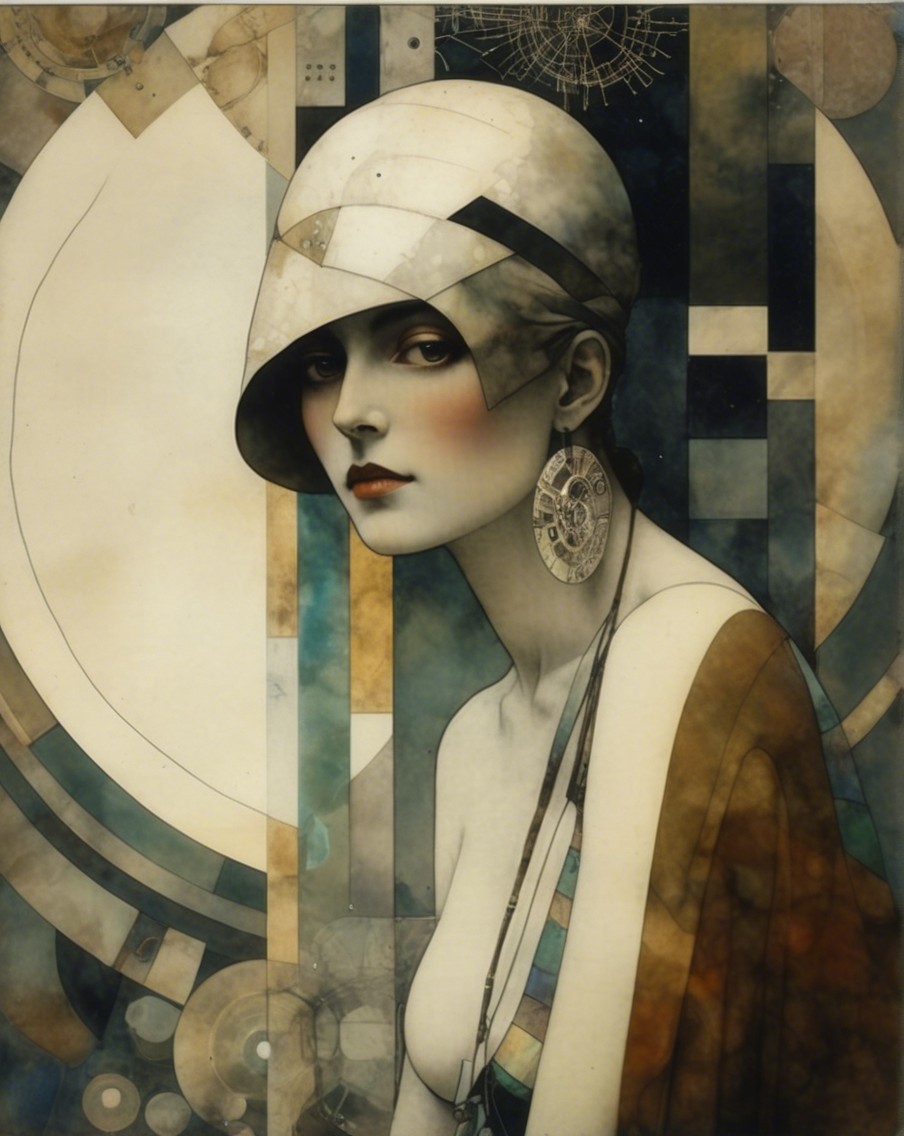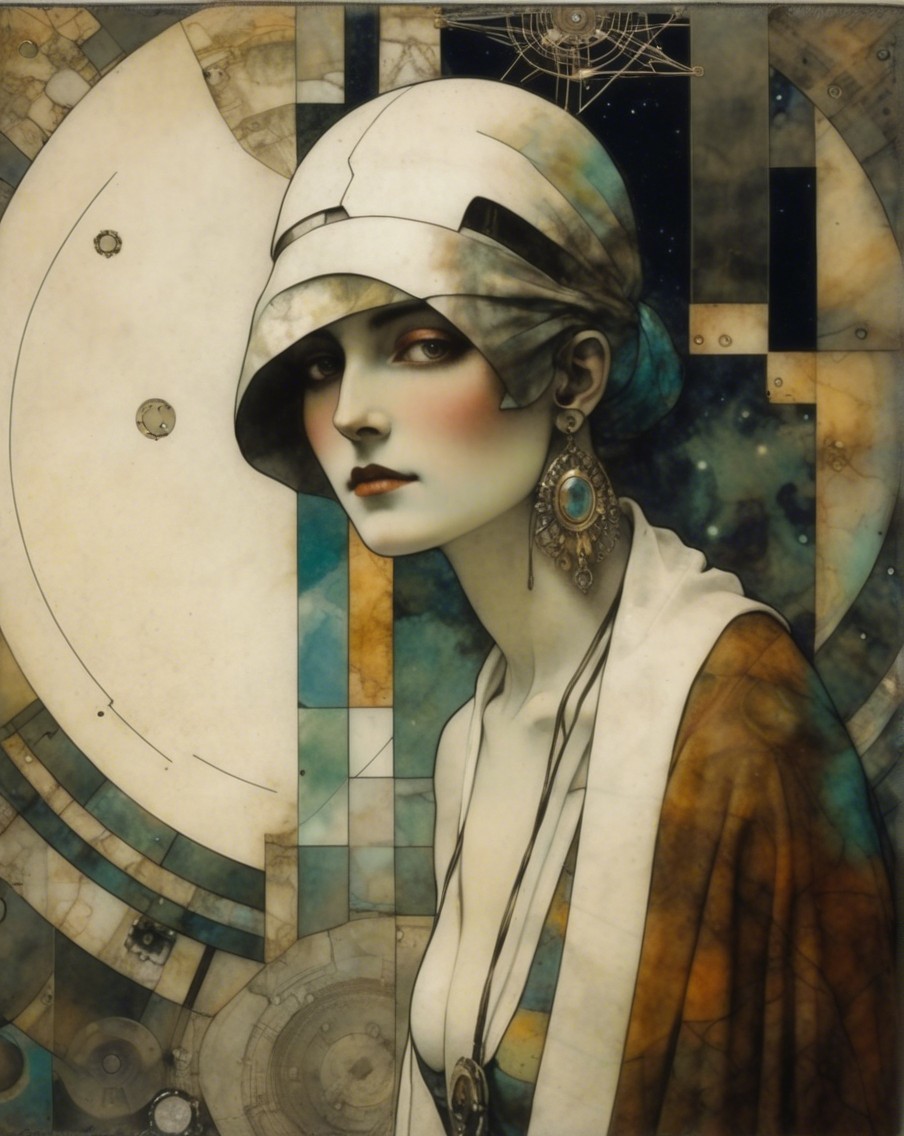 The image features a stylized woman with elegant, vintage attire and intricate accessories. Her expression is thoughtful, with a backdrop of geometric patterns and soft, earthy tones.
