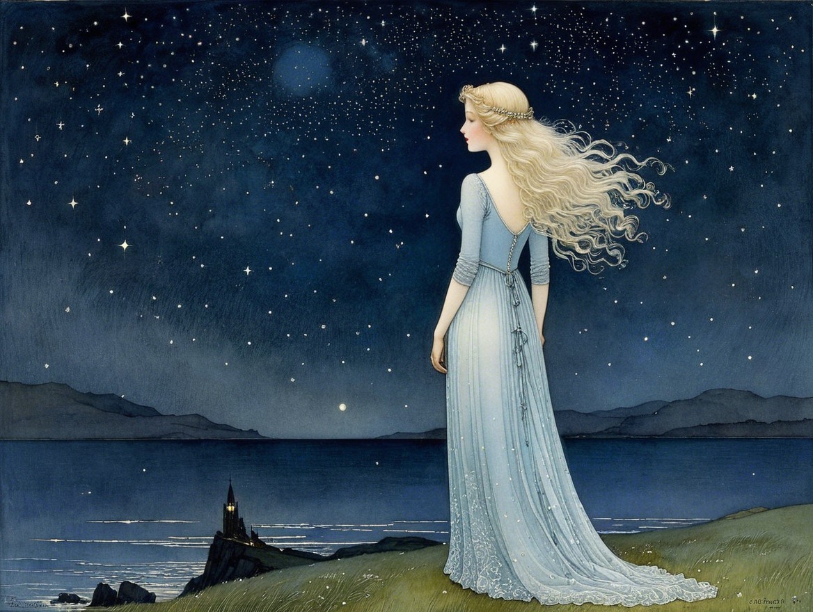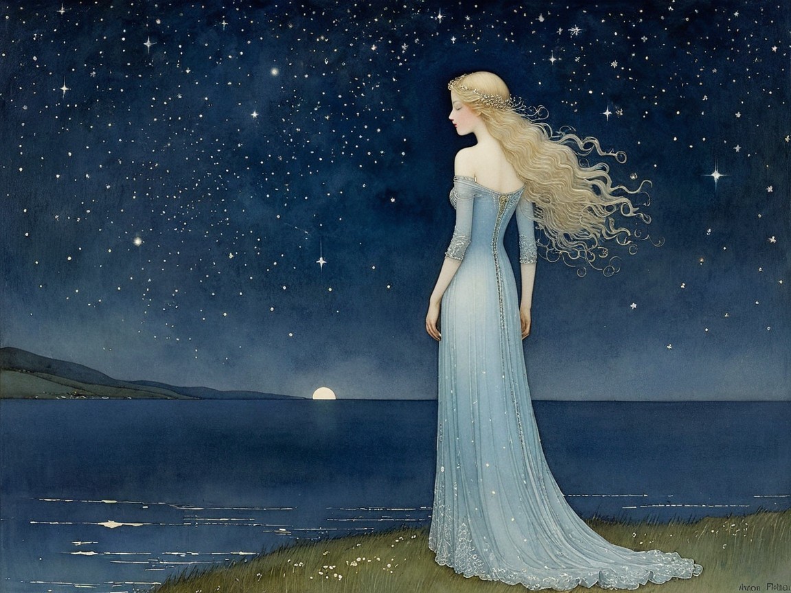 A serene figure stands by a tranquil ocean at night, gazing at a starry sky. Dressed in a flowing gown, her long hair billows in the breeze as a distant ship sails across the calm waters.