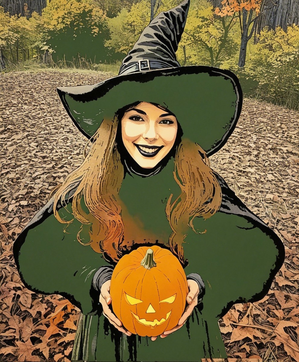 Indiecore-inspired woodblock print featuring a stylized portrait, juvenile essence, foiliage, layered, joyful, hues by Ho Baron, tints by Stan Lee, whimsical watercolor and ink painting in estranged colors: Gothical witchwith a pumpkin, stacked-up perspective,woodcut-inspired graphics, foliage, displacement mapping, raytraced shadows 1.8, texture mapping, (phong shading, surreal fissured hues in a plique-à-jour technique, stylized, ((soft coloring: browns, greens, greys, whites), gentle, flakes, natural lighting, dynamic lighting effects) 8:11), precise gelsculpt 64k, outlines that intricately define 3d effects, uhd, hdr, vfx-inspired, hues by Man Ray, micro-pen lines in Woodblock Print style with diffusion, textured skin by William Bradley, sawtooth wave, overall composition by John Buscema and Stan Lee, negative lucas numbers, cel-shaded, visible textures, 5 point lighting, brightness 1.5, layered linework, plasticity 1.1, warm toned ethereal glow, reminiscent of autumn academia, supernatural, shabby linocut merged with collagrapy, whimsical intricate linework, detailed linocut & collagraphy coloring, stylized layered textures, fragmented painterly style by Ed Binkley, hand-drawn illustration style, irregular strokes, blotting, overall composition by Stan Lee