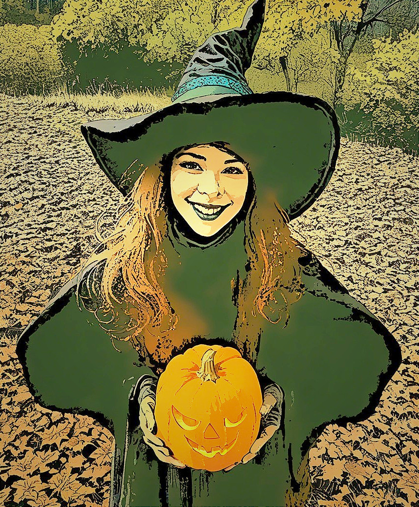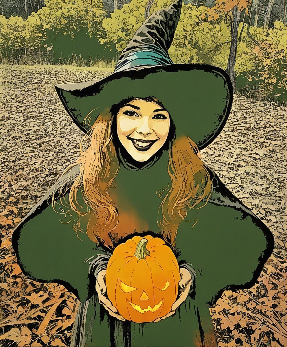 Indiecore-inspired woodblock print featuring a stylized portrait, juvenile essence, whimsical watercolor and ink painting in estranged colors: Gothical witchwith a pumpkin, stacked-up perspective,woodcut-inspired graphics, texture mapping, phong shading, surreal fissured hues in a plique-à-jour technique, stylized, dynamic lighting effects, subsurface scattering 1.9, dyed, parallax occlusion 1.3, close-up, stacked-up perspective, emulsion shifts, dotted, flecks, points, grain, surreal cymatics, catenaries, natural background in simplistic style of Richard Serra, tetradic color scheme light-orange rosewood-pink dark-green light-black, gradient inking for colorful yam, warm coloring, comic book cover art  reminiscence, hyper-maximalism, soft rounded edges, watercolor and alcoholic aquatint, airbrush technique & dappled tones, contoured, line-art, high coloring, line-art details by Ho Baron. 3D textures, parallax occlusion 1.4, shadow mapping, dof, debeh, bokeh, vfx, LiDAR point cloud with stacked lines, plasticity 1.3, precise gelsculpt 64k, outlines that intricately define 3d effects, uhd, hdr, vfx-inspired, hues by Man Ray, micro-pen lines in Woodblock Print style with diffusion, textured skin by William Bradley, sawtooth wave, overall composition by John Buscema and Stan Lee, negative lucas numbers, cel-shaded, visible textures, 5 point lighting, brightness 1.5, layered linework, plasticity 1.1, warm toned ethereal glow, reminiscent of autumn academia, supernatural, shabby linocut merged with collagrapy, whimsical intricate linework, detailed linocut & collagraphy coloring, stylized layered textures, fragmented painterly style by Ed Binkley, hand-drawn illustration style, irregular strokes, blotting, overall composition by Stan Lee