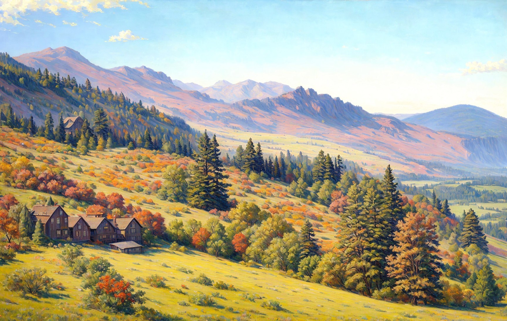 A vibrant landscape painting showcasing rolling hills adorned with autumn foliage, quaint houses nestled among lush trees, and distant mountains under a bright blue sky.
