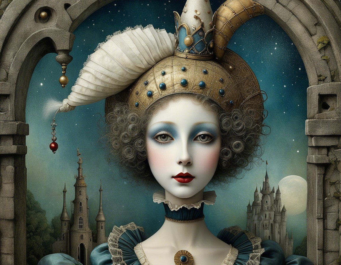 A dreamy, surreal portrait features a pale-skinned figure with dramatic makeup and an elaborate hairstyle, adorned with skull details, set against a whimsical castle backdrop.