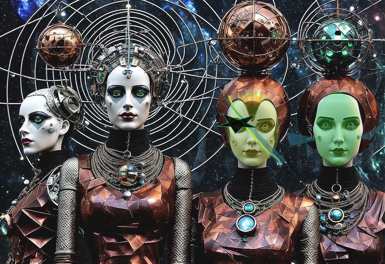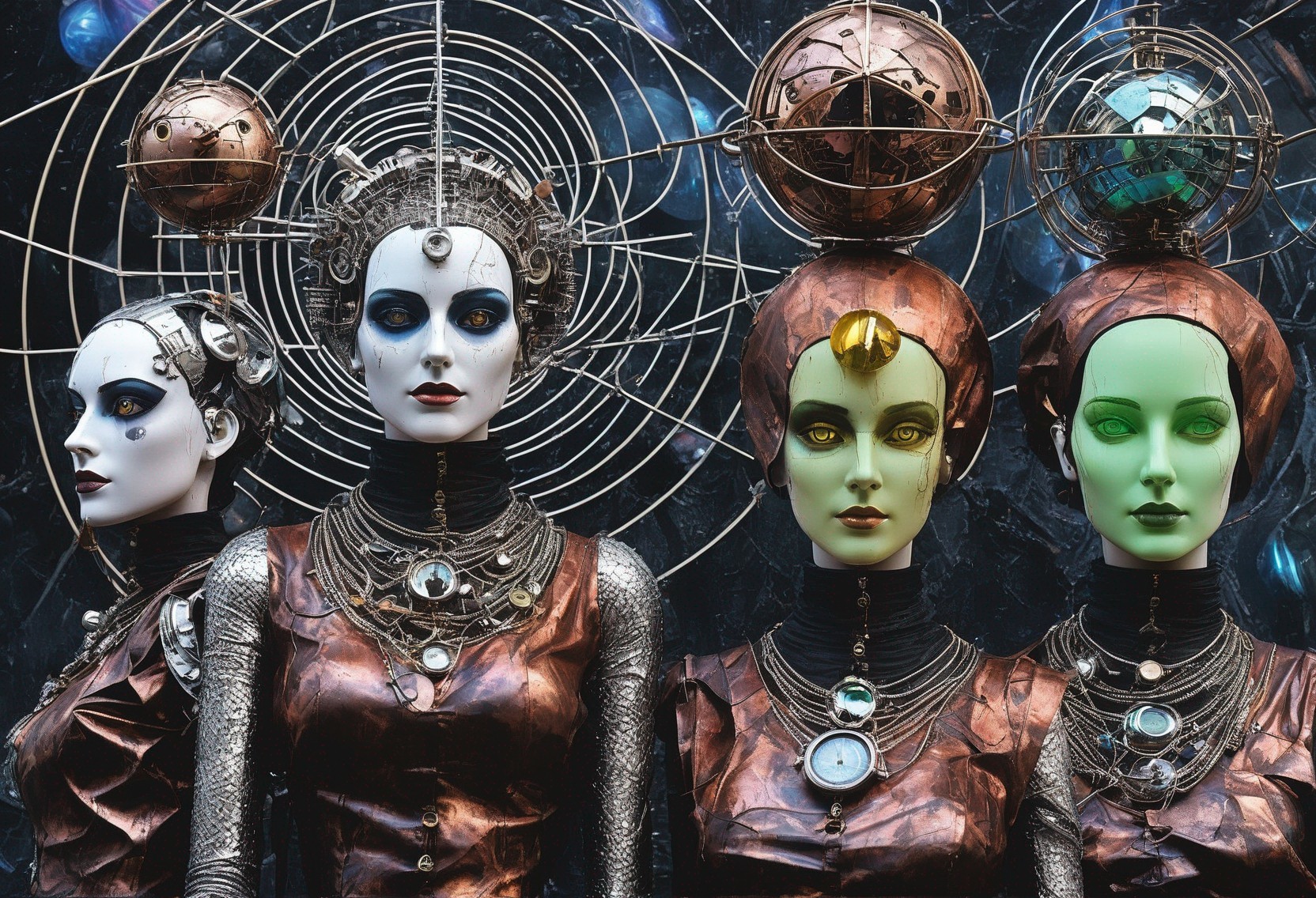 Four futuristic female mannequins with metallic makeup, wearing ornate headgear and bronze outfits, evoke a sci-fi aesthetic.