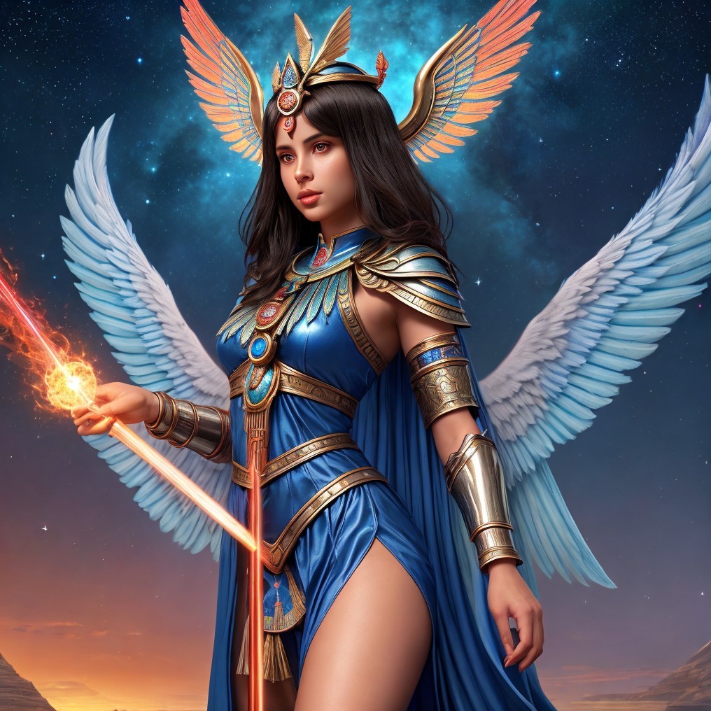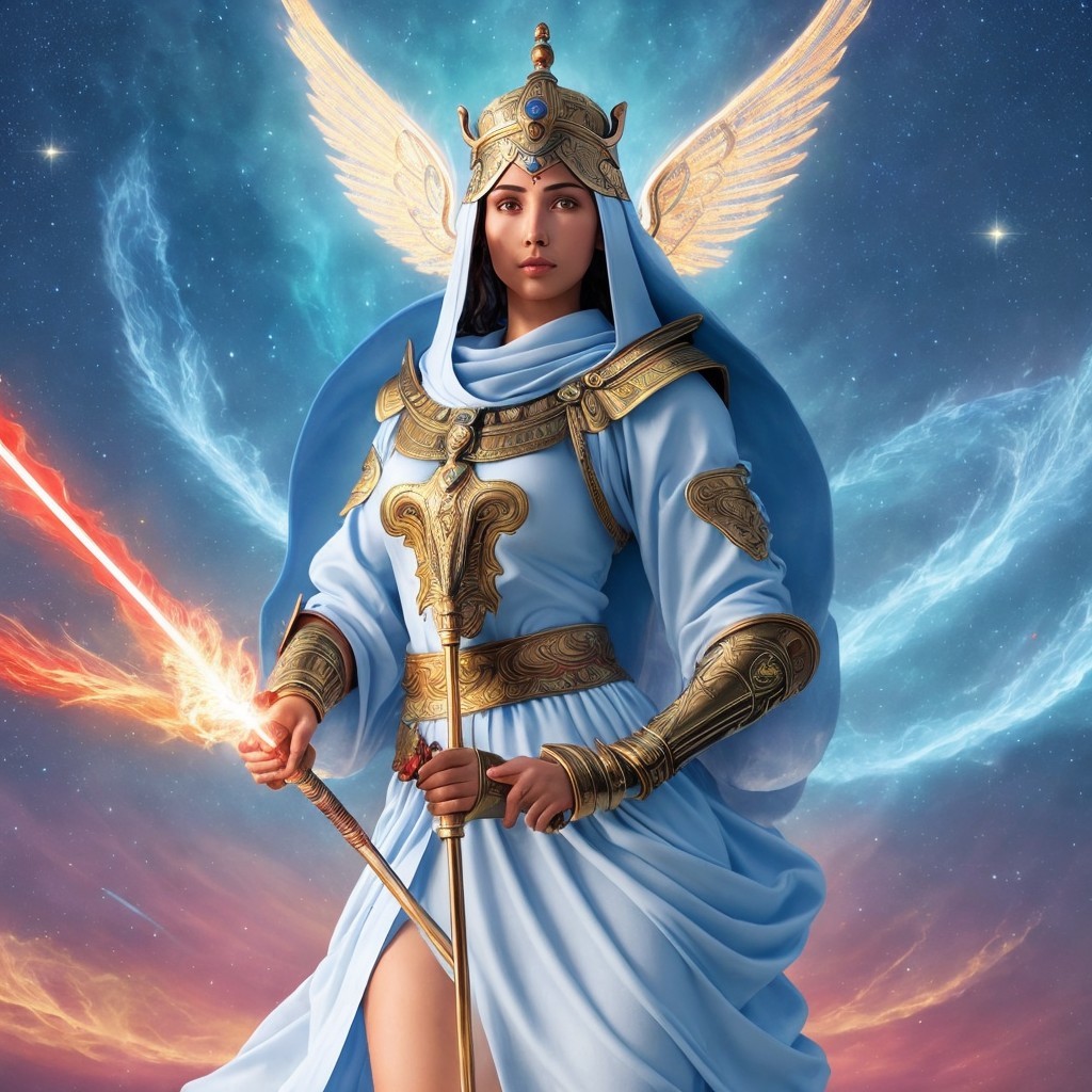 BEAUTIFUL PROMETHEA in BLUE COTTEN ROBES and BRONZE ARMOR WITH RED TRIM HOLDING A GLOWING STAFF TOPPED WITH A CADEUSUS FLAMING WITH HOLY FIRE, wings, stars in the background, fantasy, Egyptian art, GODDESS, ART, FIRE, WATER, ARIES, AQUARIUS, LANGUAGE, COMMUNICATION, BORDERS, INSPIRATION, MAGIC, FEMALE, POWER, STRONG ARMS, WARRIOR, THICK, SILVER HAIR