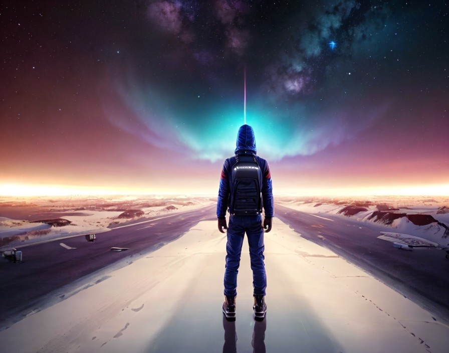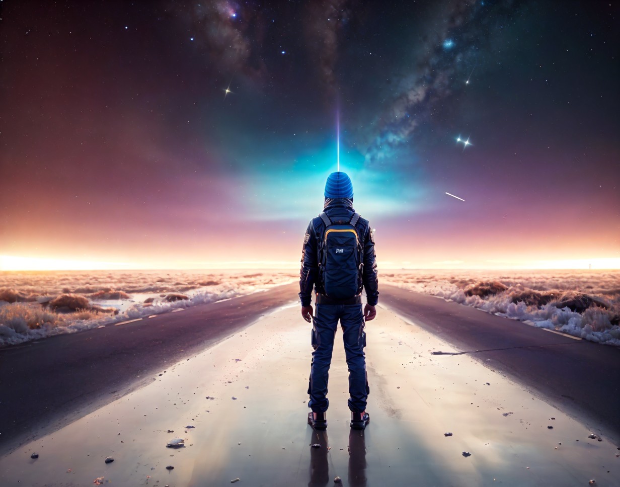 A lone astronaut stands on a surreal, ethereal pathway amidst clouds, gazing at a vibrant cosmic landscape filled with stars and galaxies, illuminated by a glowing blue light.