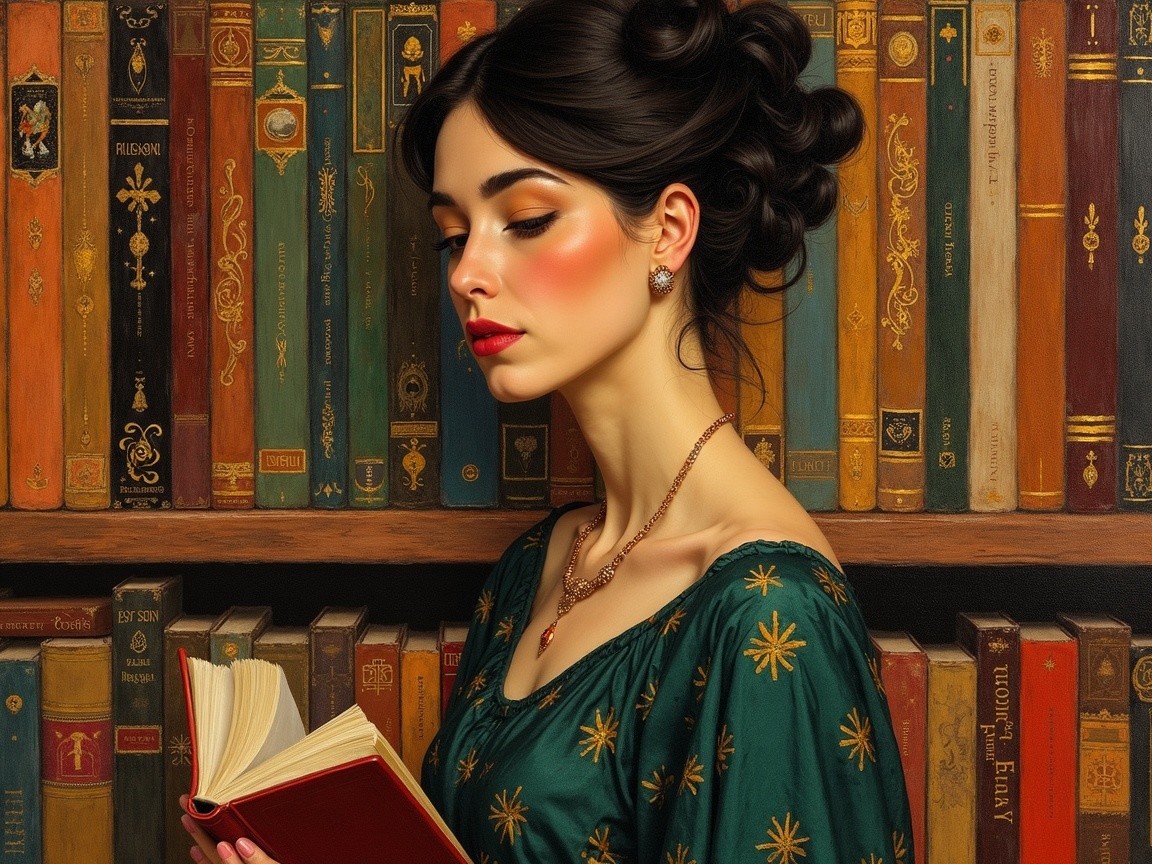 A young woman with dark hair and a green dress reads a book in front of a richly colored bookshelf. Her elegant accessories and serene expression add a timeless, literary charm to the scene.