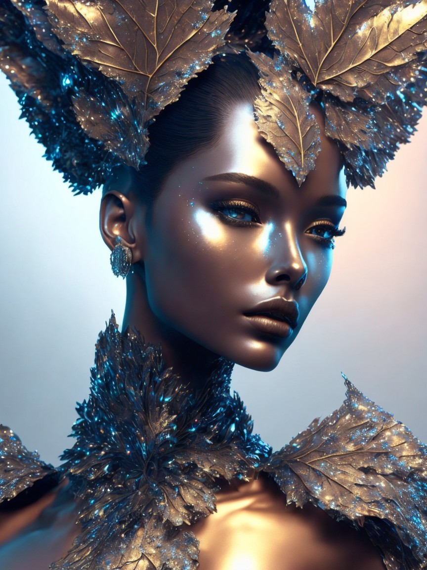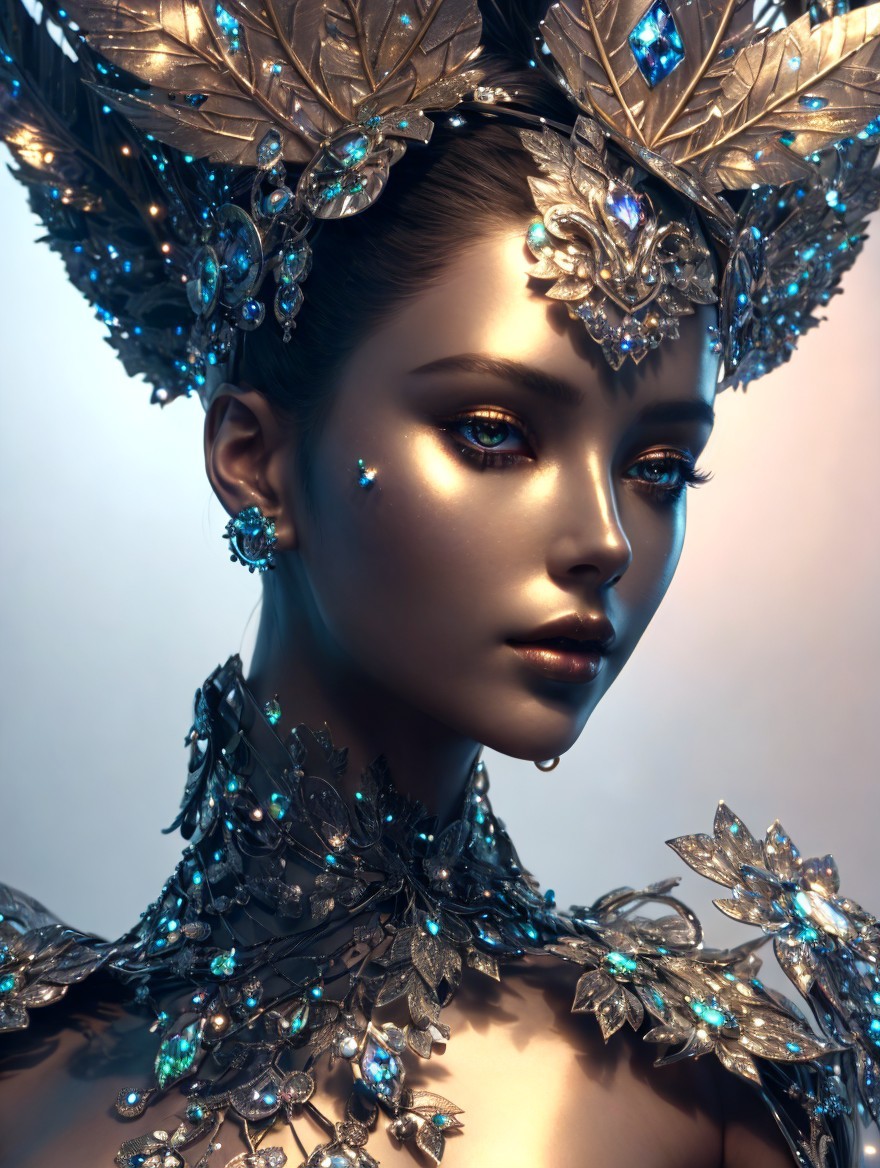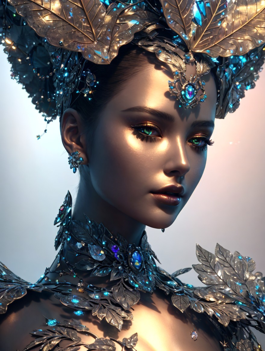 Prompt: "A hauntingly beautiful 3D render, with absurdly high detail, depicting a cybernetic android nymph, attractive physique, gorgeous legs, graceful, with silvery skin, shining like metal, adorned with shimmering gemstones, lots of leaves and inflorescences, shine, science fiction, she looks like a brilliant piece of jewelry, RTX ON, masterpiece, cyberpunk, neo-rococo, Viktor Vasnetsov, Akihiko Yoshida,"