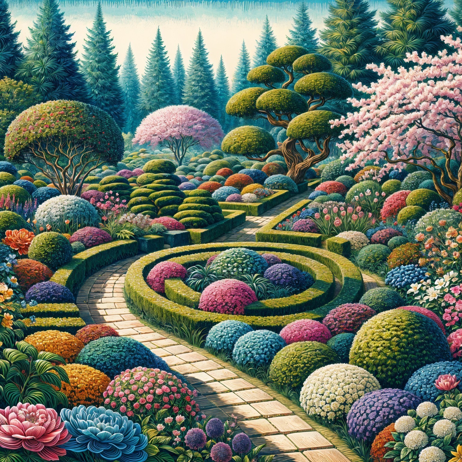 A vibrant garden path winds through lush greenery, with colorful flower beds in pink, white, and purple. Towering trees and fluffy clouds create a serene, picturesque landscape filled with beauty.