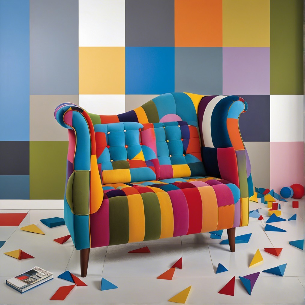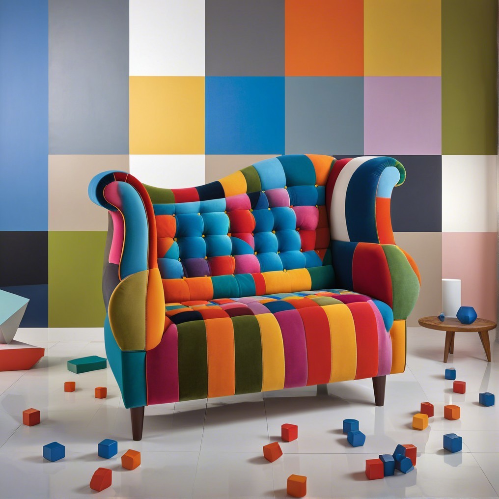 A vibrant, multi-colored sofa with a patchwork design sits against a wall of colorful squares. Colorful wooden cubes scatter around, enhancing the playful and modern aesthetic.