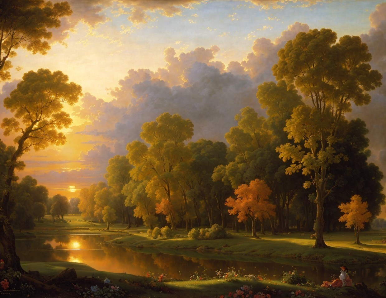 Oil on canvas, wide angle landscape view, a wonderful sunrise. Glowing with vibrant hues. Perfect composition. By Jean-Antoine Watteau. By François Boucher. By Maxfield Parrish.