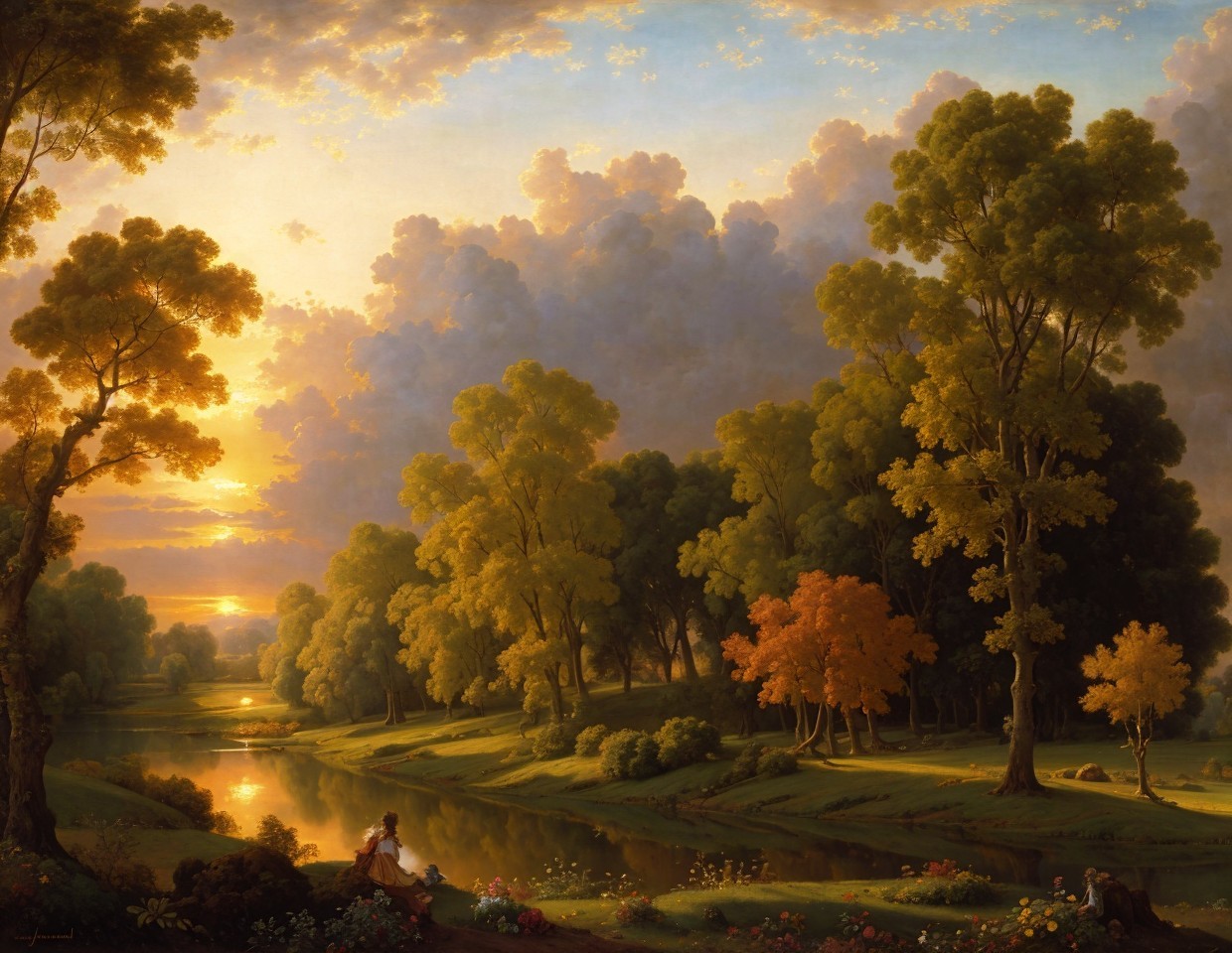 Prompt: Oil on canvas, wide angle landscape view, a wonderful sunrise. Glowing with vibrant hues. Perfect composition. By Jean-Antoine Watteau. By François Boucher. By Maxfield Parrish.