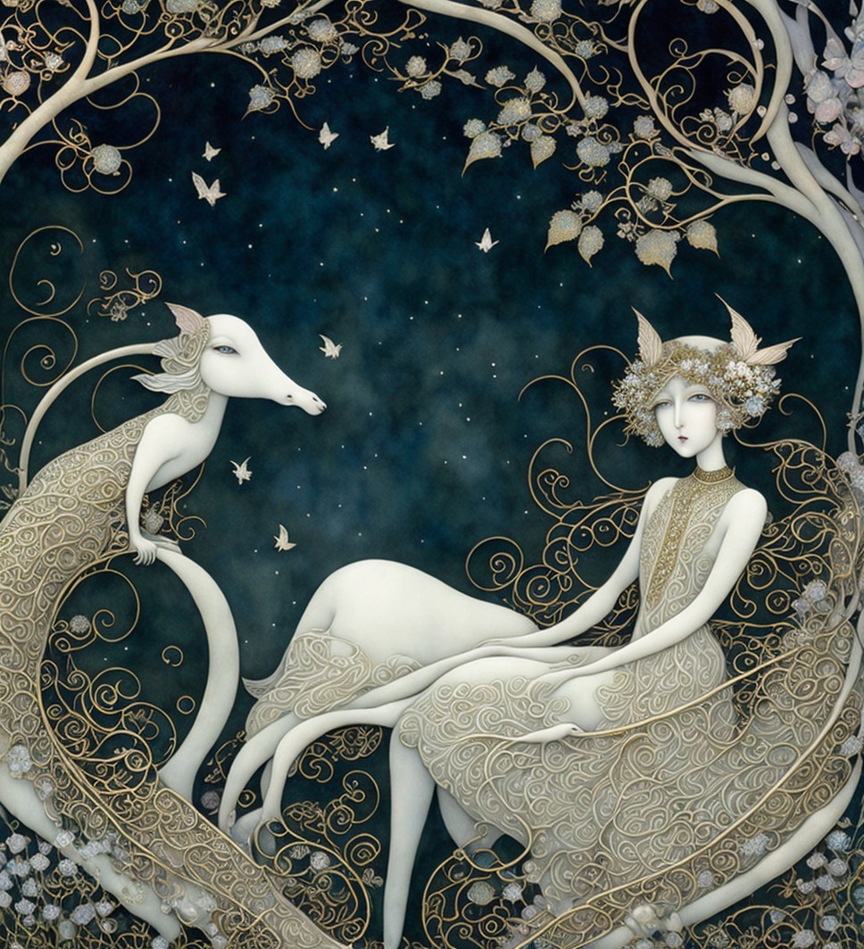 A serene scene features a woman in a flowing white gown sitting gracefully among intricate vines and flowers, accompanied by a whimsical bird, all set against a deep blue background.