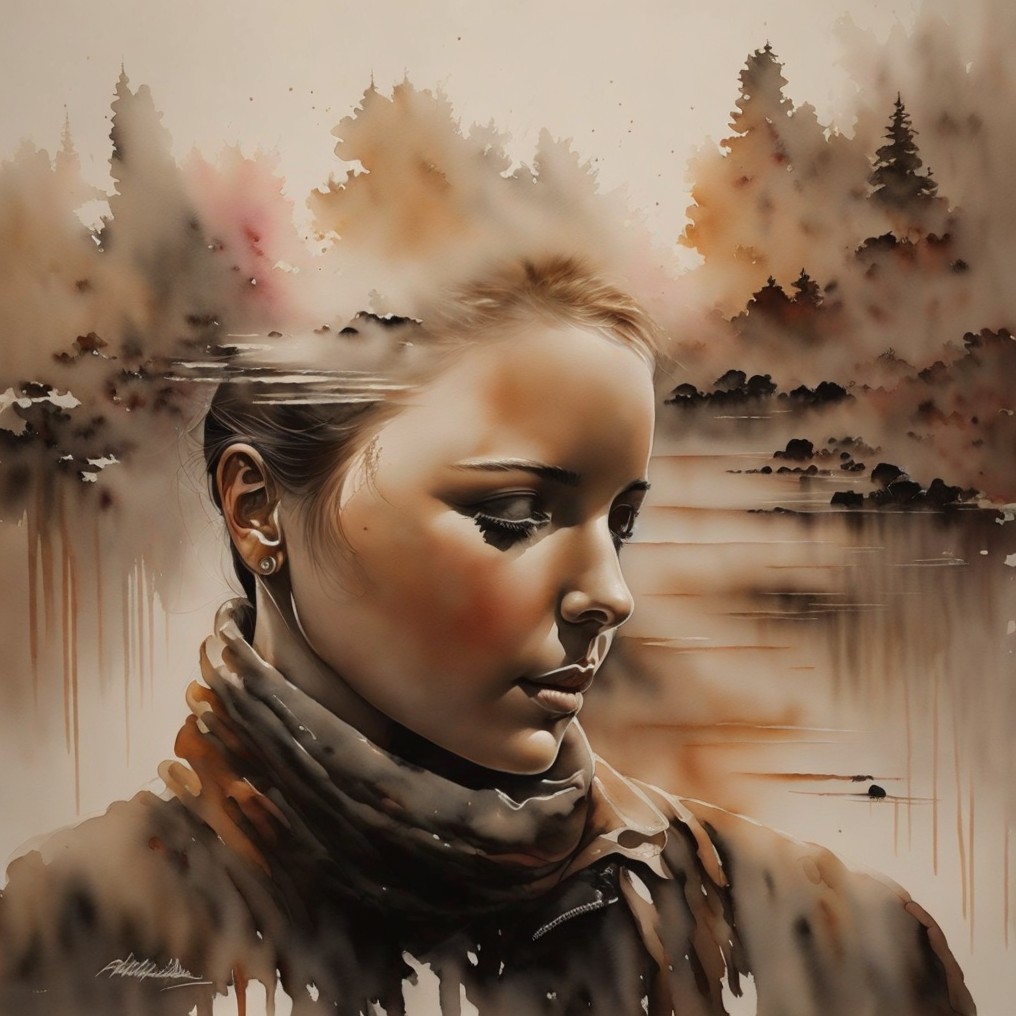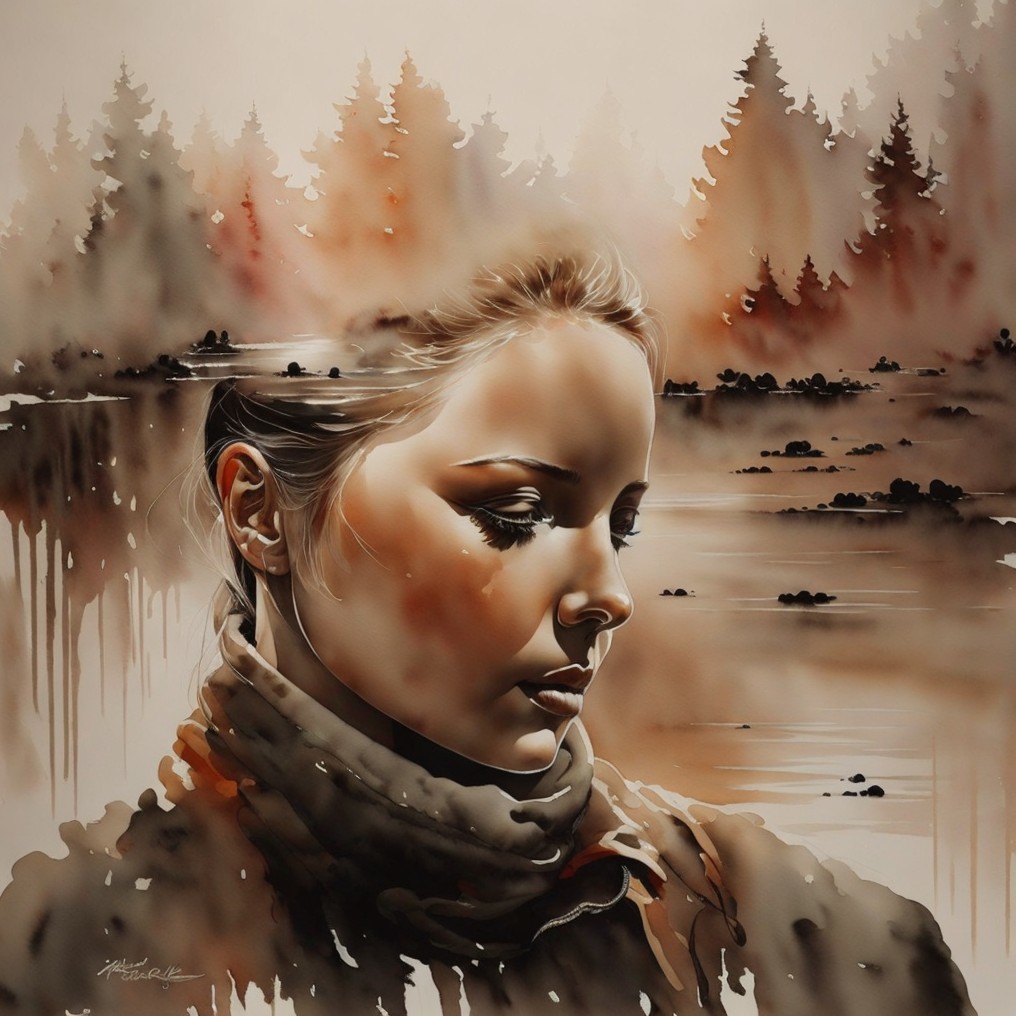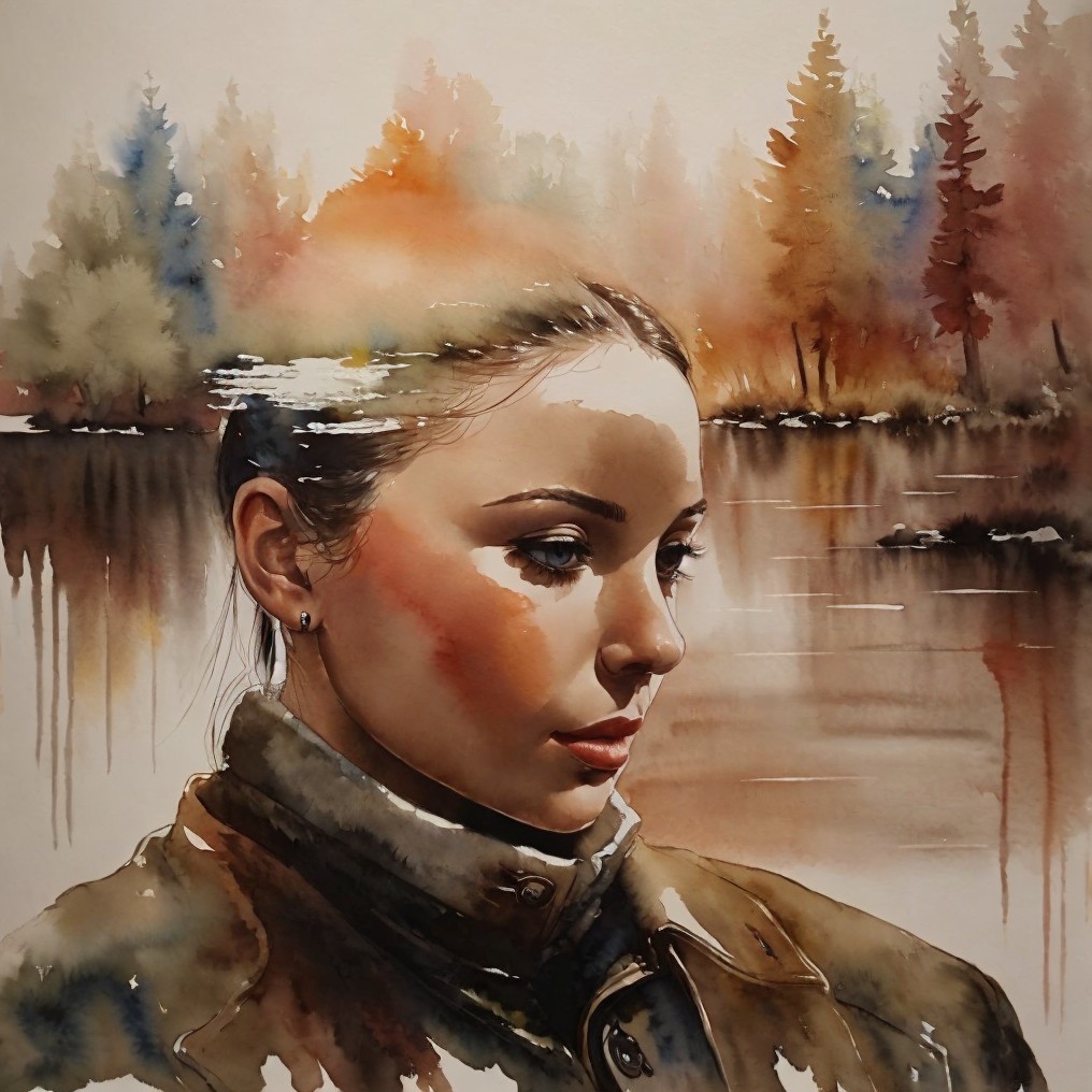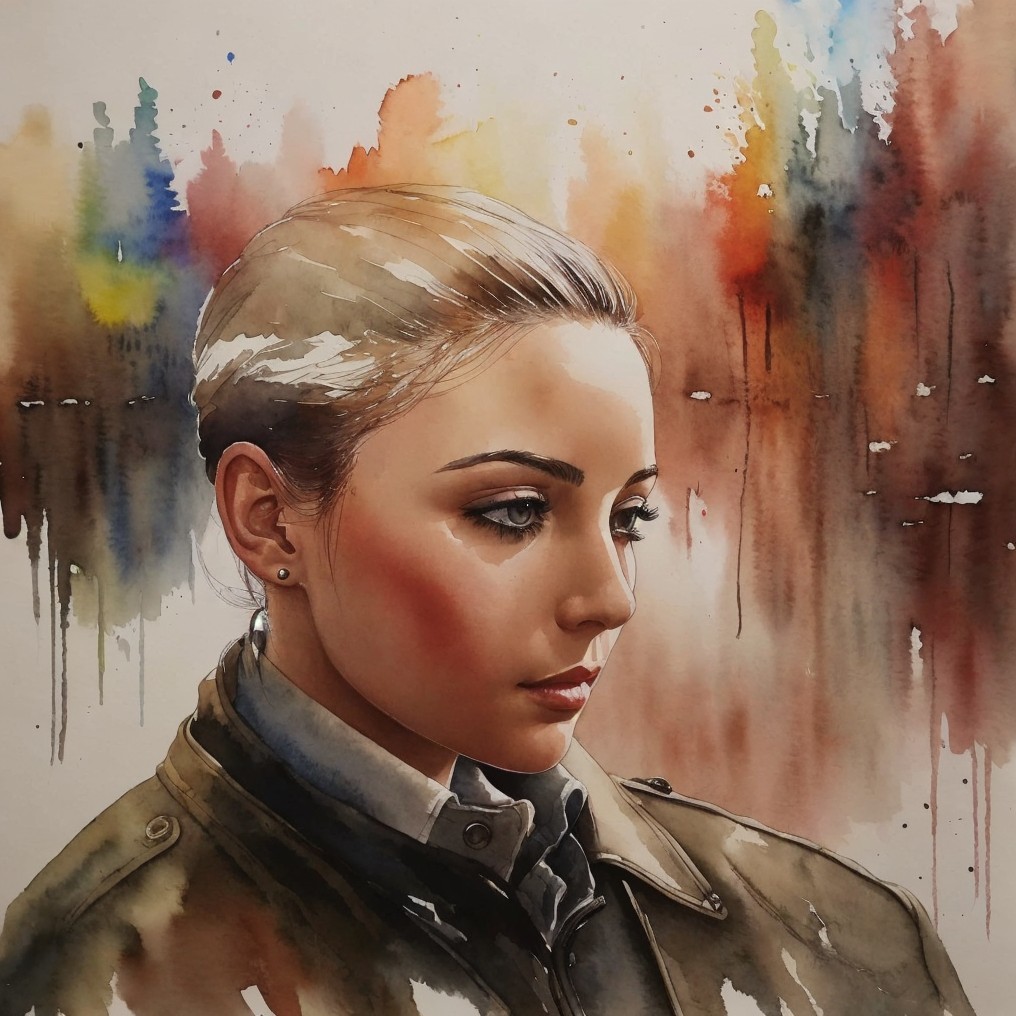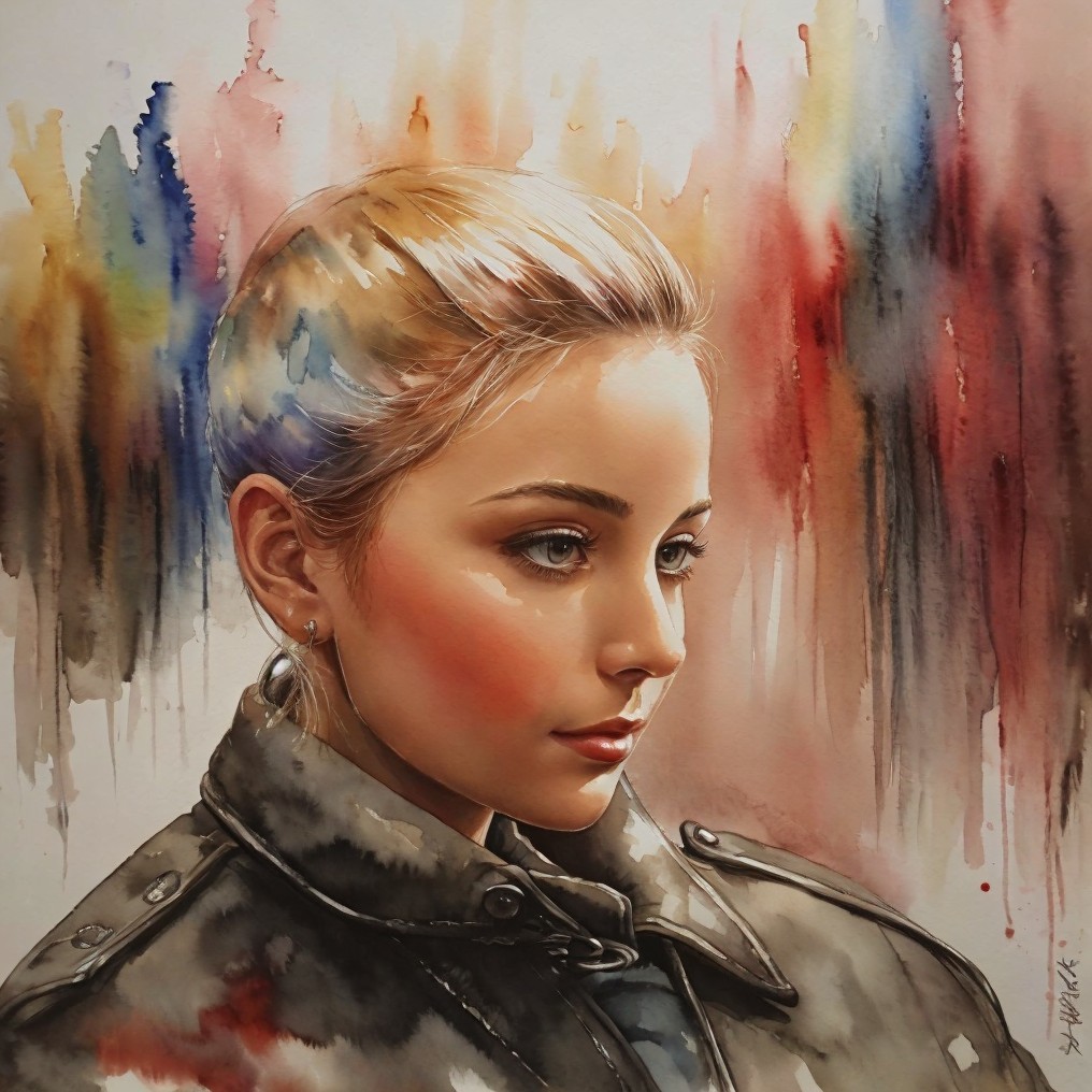 A watercolor portrait of a woman with rainbow-colored hair and a leather jacket, featuring vibrant, dripping background hues.