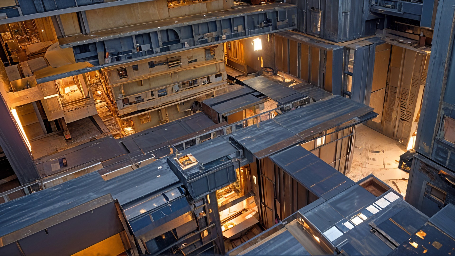 The image showcases a modern warehouse interior with multiple levels of shelving filled with blue boxes. Warm, glowing lights illuminate the space, highlighting the industrial design and structure.