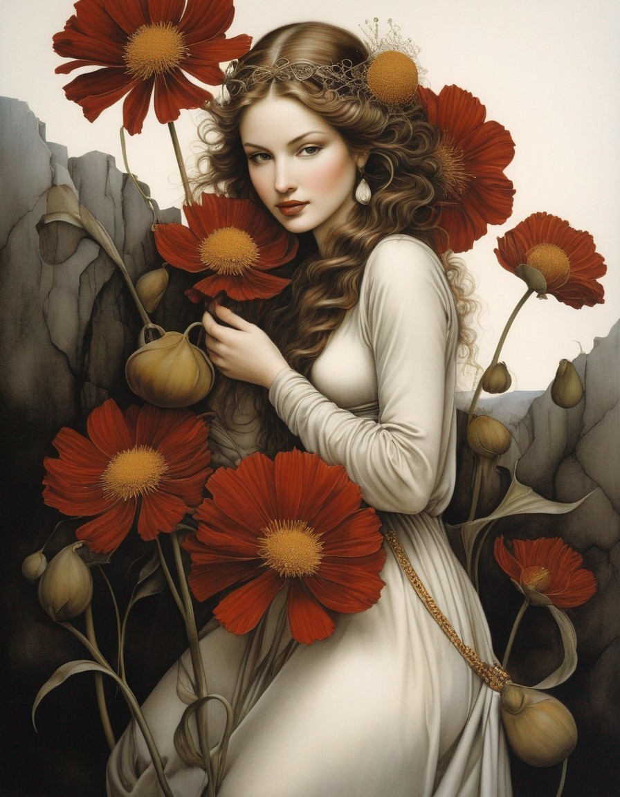An ethereal woman surrounded by golden orbs and autumn leaves, exuding a serene and fantastical aura.