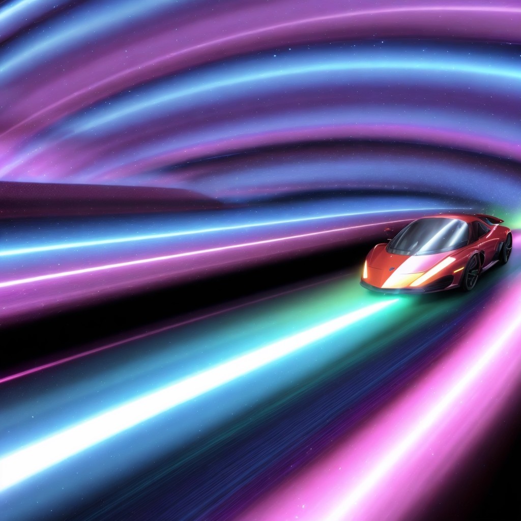 A sleek, futuristic race car with a vibrant blue and purple color scheme speeds against a dynamic, sunset-hued backdrop.