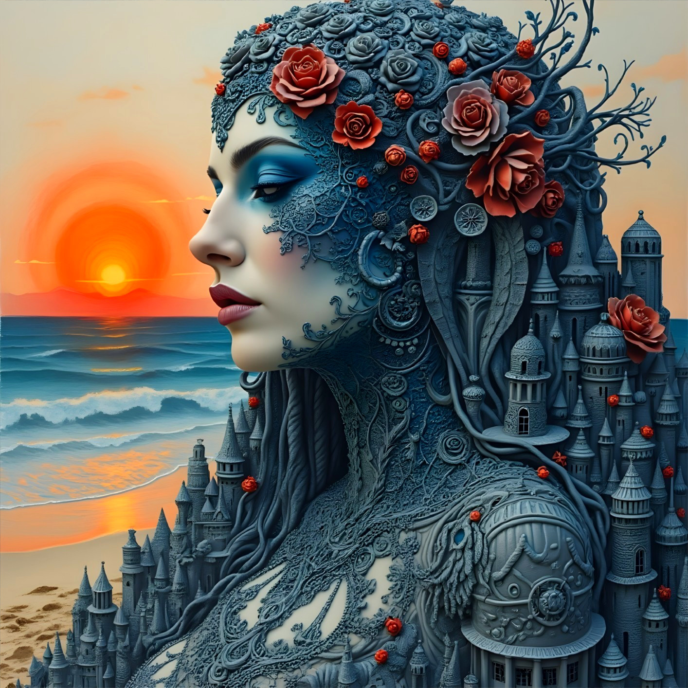 A stunning acrylic artwork depicts a woman transformed into a sandcastle, featuring intricate details and vibrant colors against a breathtaking sunrise. The surrealistic style captivates with elegance and beauty. Thanks to whoever wrote this amazing prompt that I edited.