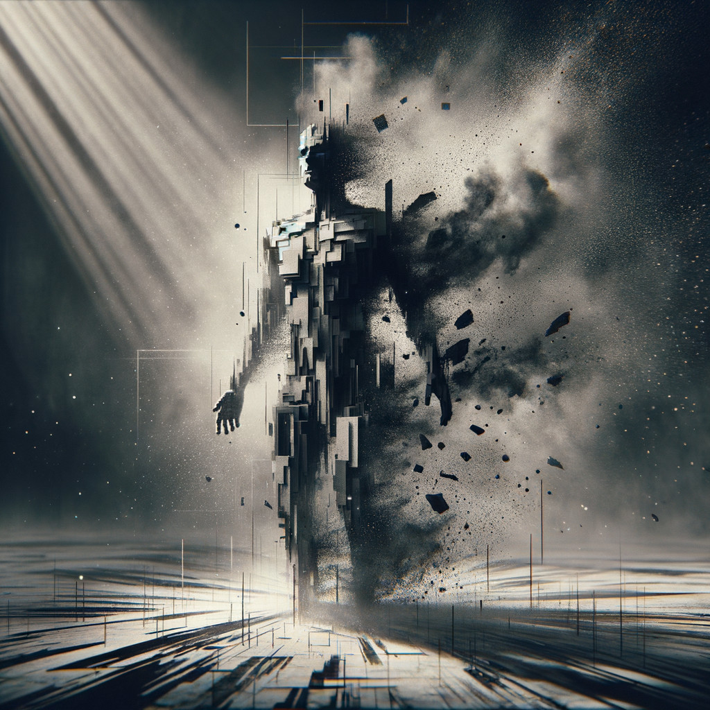 A figure, stylized as a human form, appears to be composed of numerous rectangular and square panels, resembling a glitchy or fragmented digital construct. This figure stands upright, its right arm slightly extended forward and its left arm partially obscured, dissolving into a cloud of dark, grainy particles and fragmented debris.